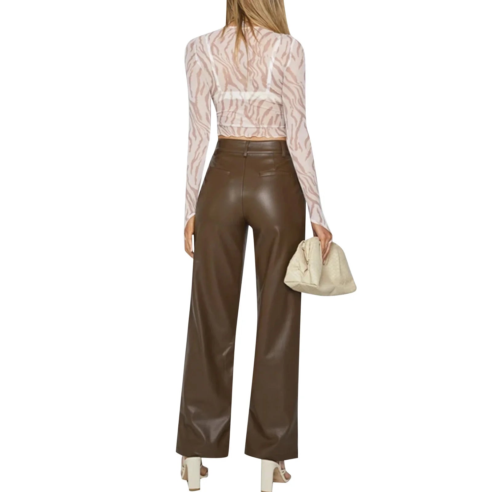 Upgrade your wardrobe with these high-waist faux leather straight-leg pants, designed for a bold and stylish look. Crafted from non-stretch waffle-textured faux leather, these full-length pants offer a regular fit with a flat front style, ensuring a sleek and modern silhouette. Featuring a button fly closure and pockets, these pants combine both practicality and chic appeal. Perfect for dressing up or adding an edgy touch to casual outfits, these versatile pants are ideal for fashion-forward looks that stand out. Pair them with a tucked-in blouse or oversized jacket for a trendy, sophisticated vibe.