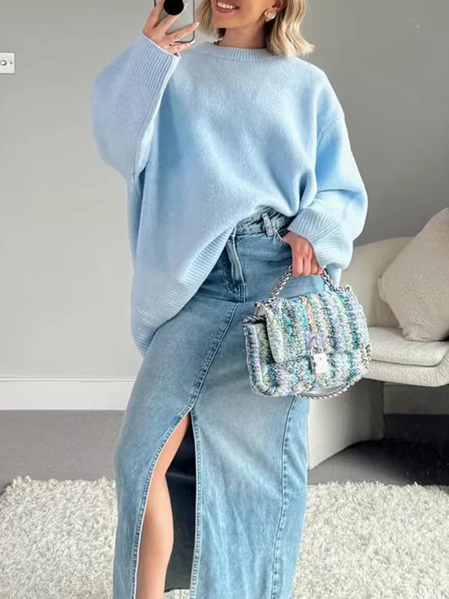 Women's Autumn Winter Knit Sweater Long Sleeve O Neck Solid Color Casual Knitwear