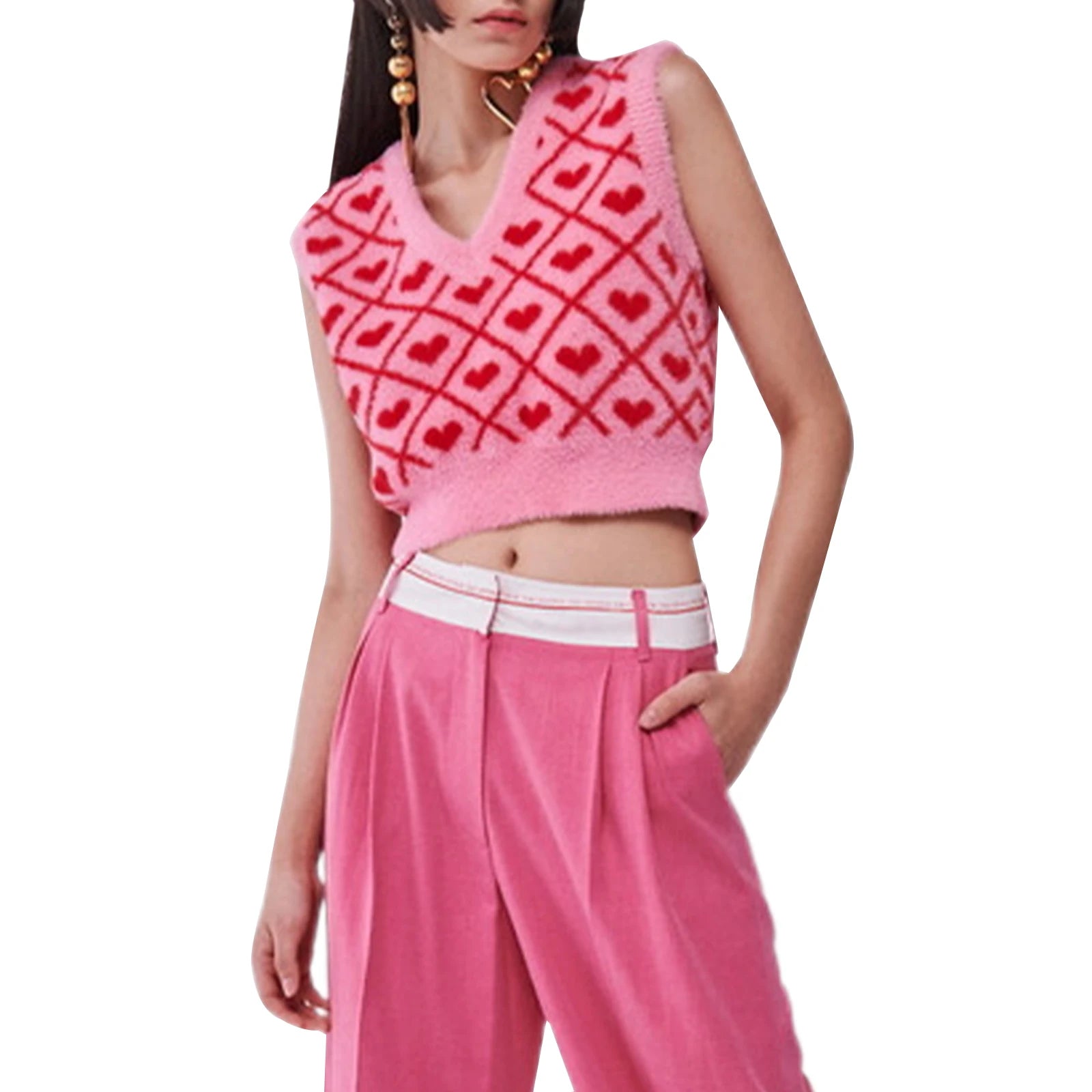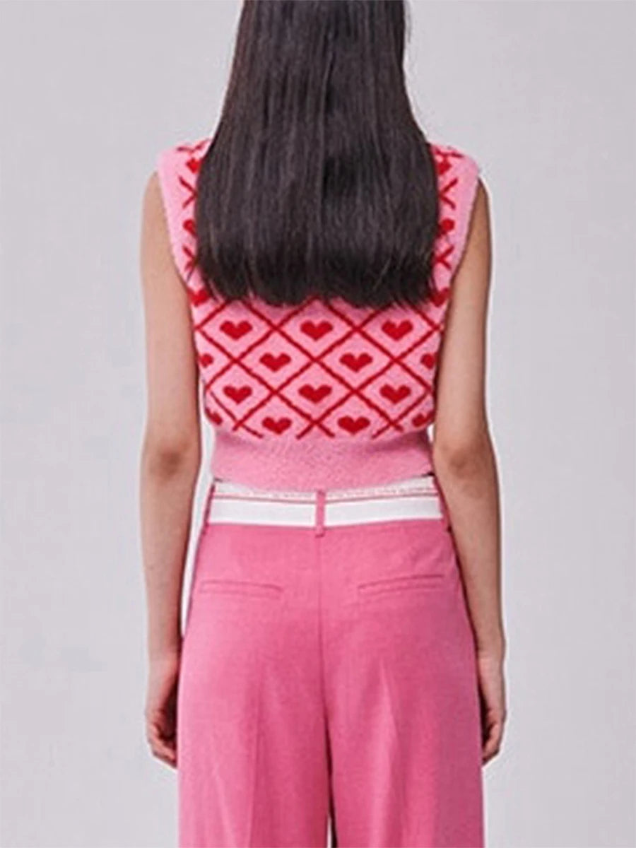 Women s Cozy Sleeveless Sweater Vest with Deep V Neckline and Heart Print Detail