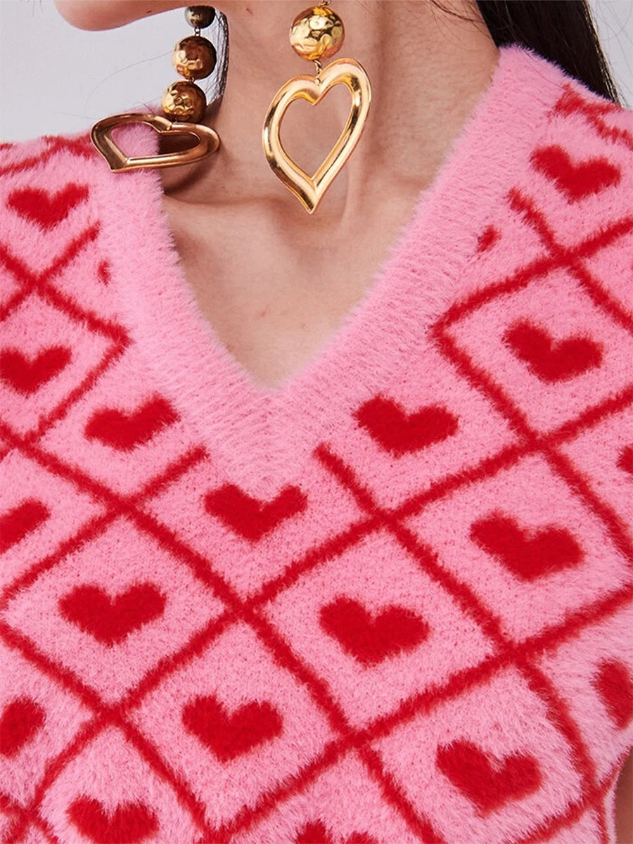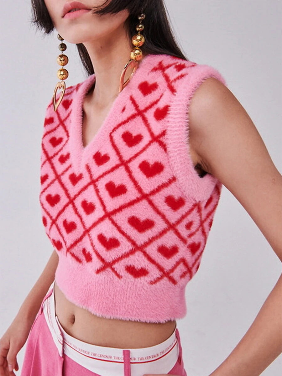 Women's Autumn Plush Sweater Vest Sleeveless Deep V Neck Heart Print Knitwear