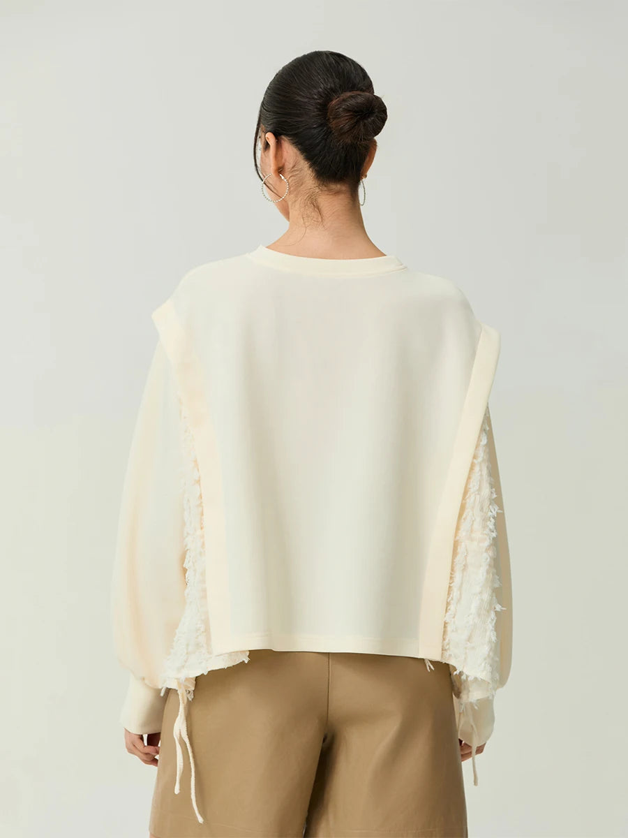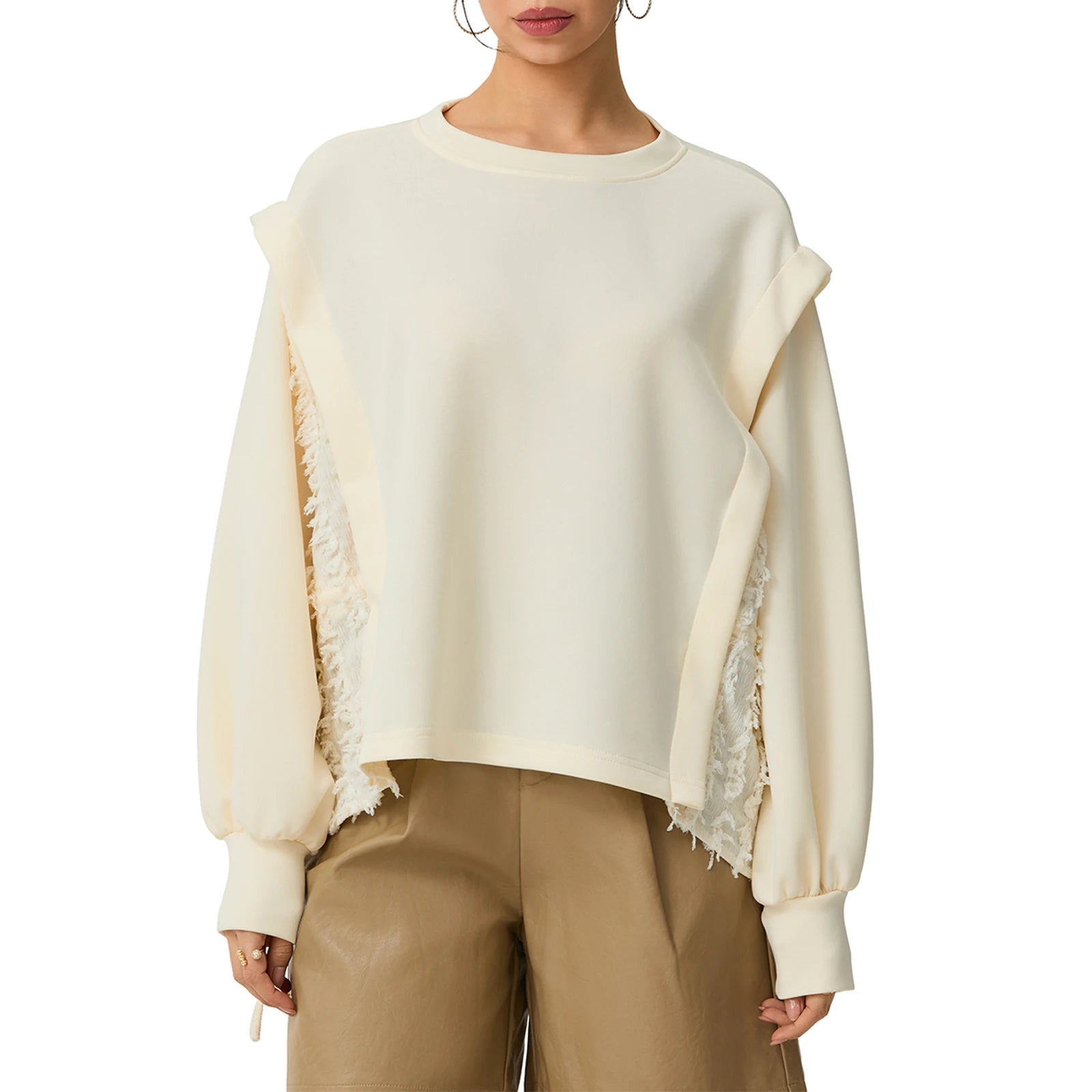 Women’s Oversized Pullover Sweater – Distressed Style, Ribbed Crew Neck, Long Sleeves, White, M