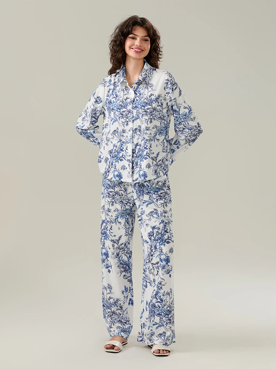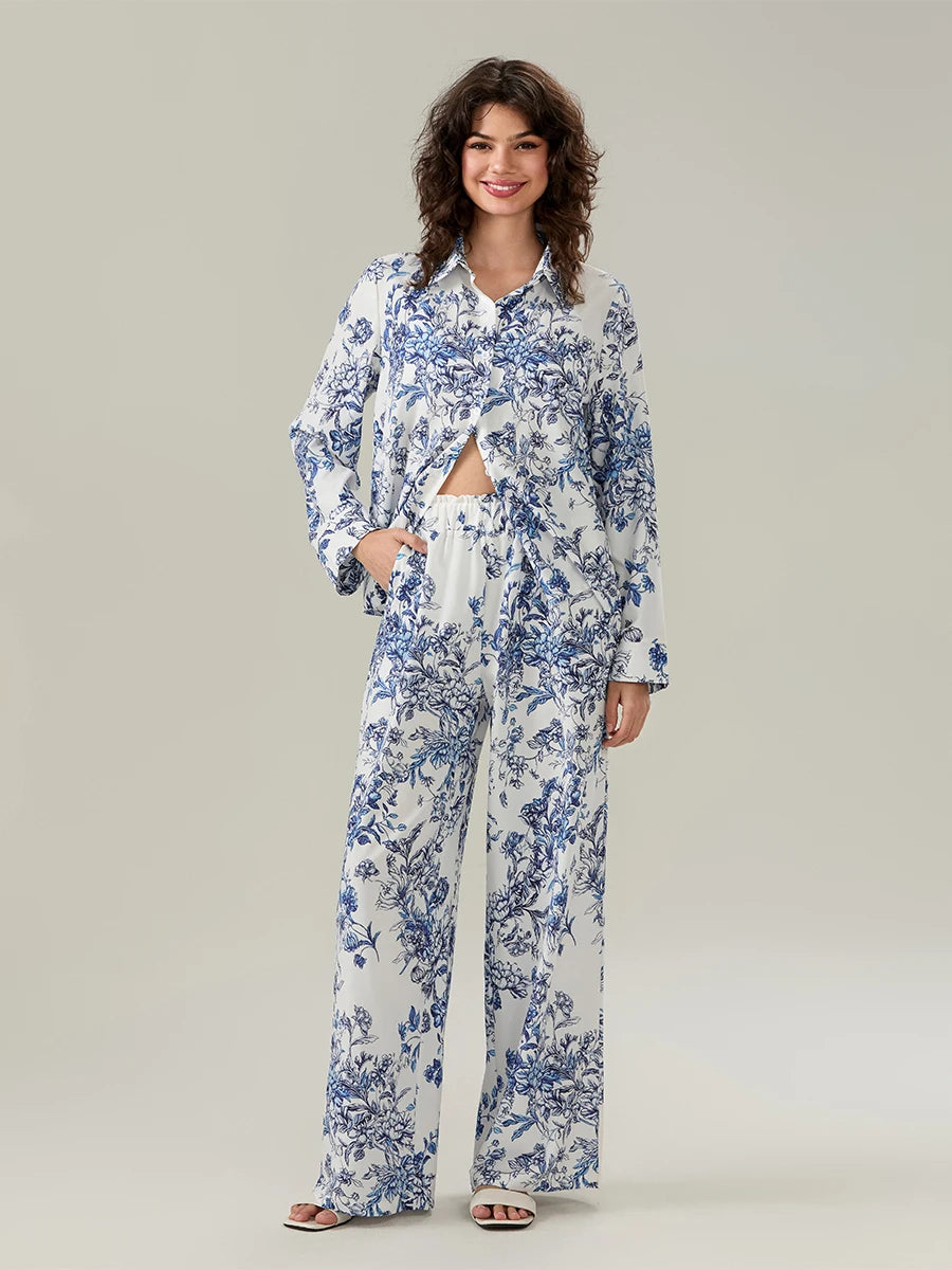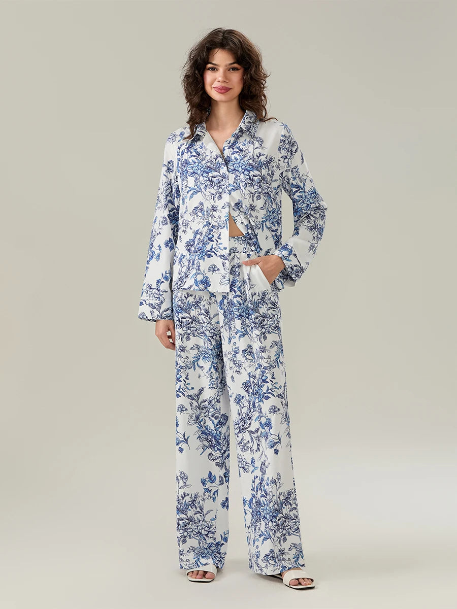 Women's Floral Print Pajama Set – Turn-Down Collar