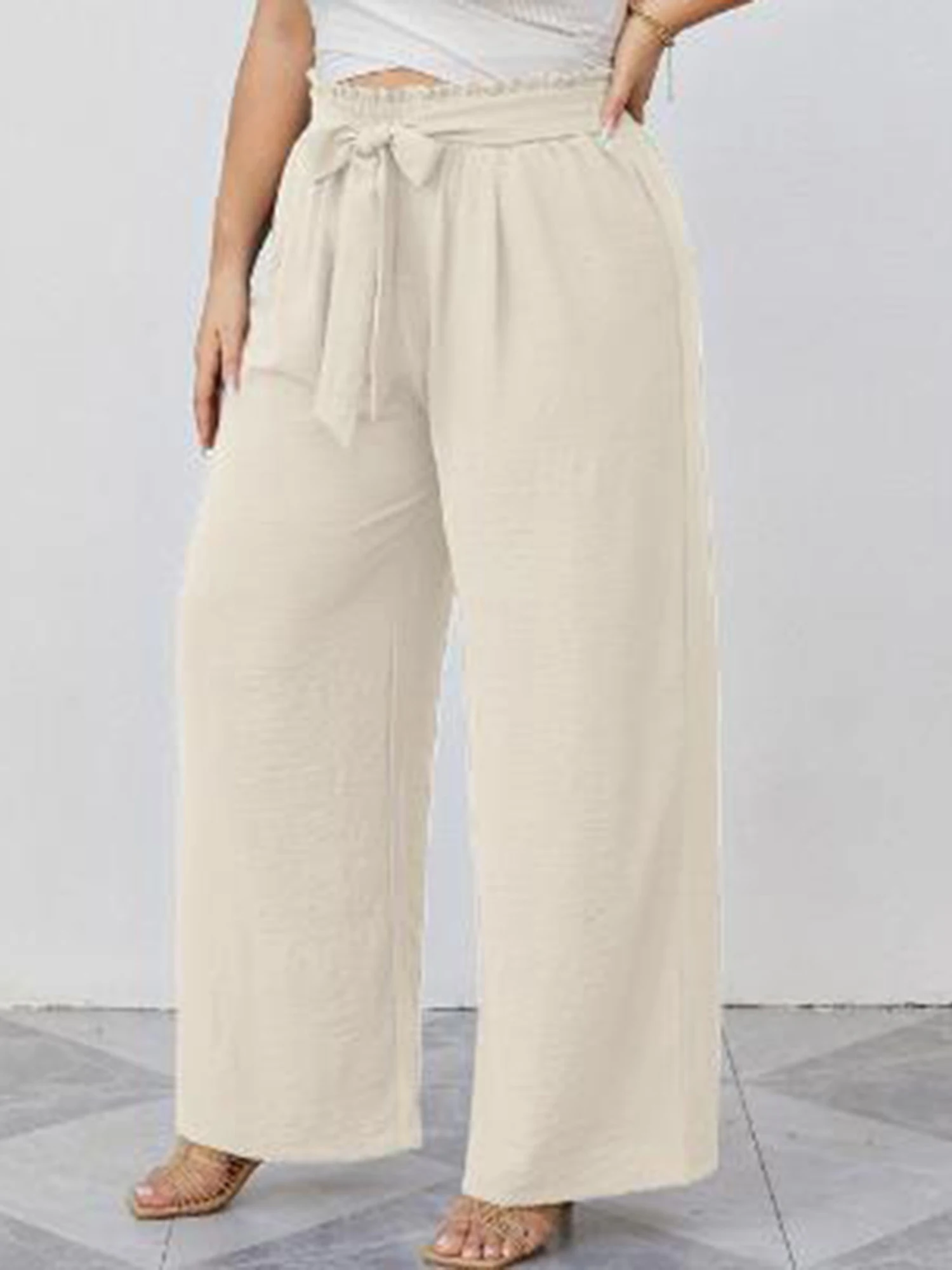 Women Casual Wide Leg Trousers Plus Size Solid Color Tie Up Belted Loose Pants with Pockets