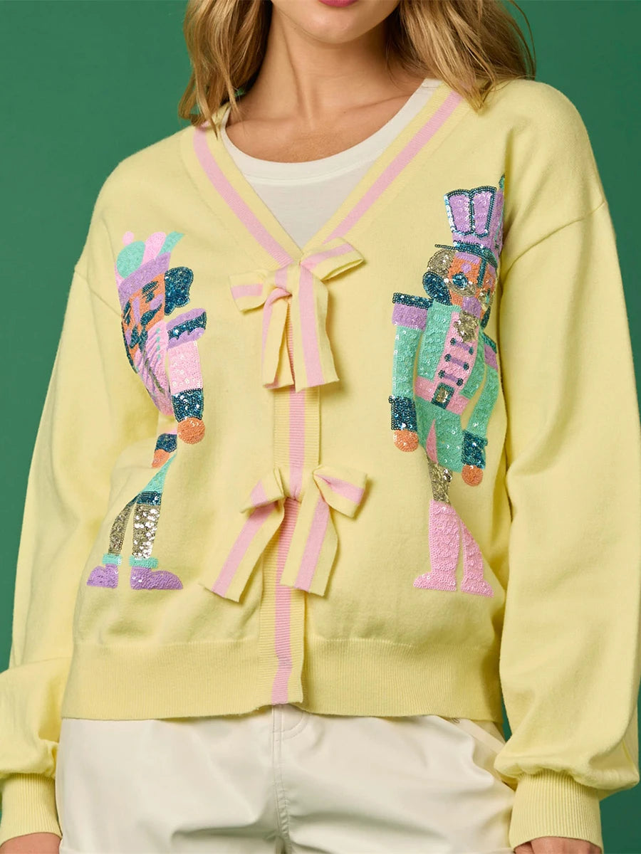 Women's Christmas Cardigan Glitter Sequin Soldier Pattern Long Sleeve V Neck Button Down Knit Sweater Outwear