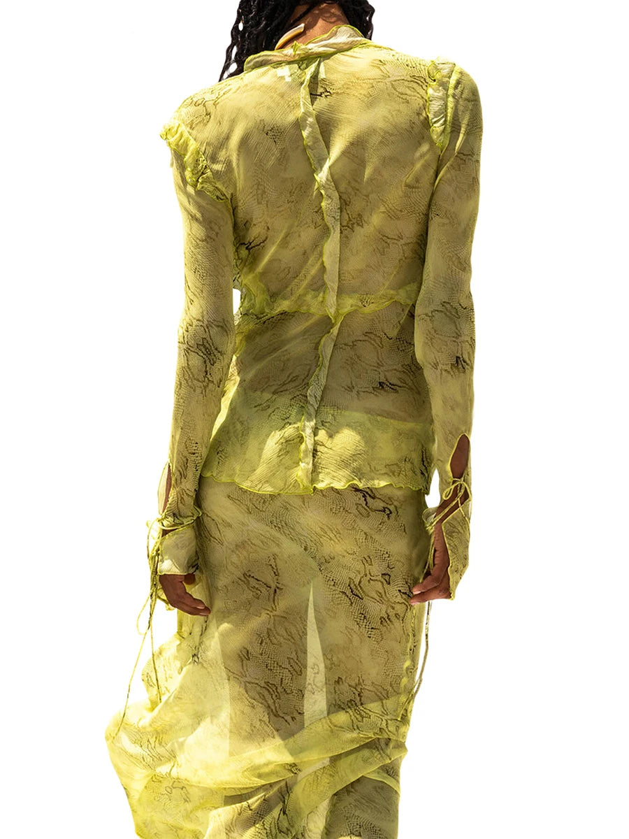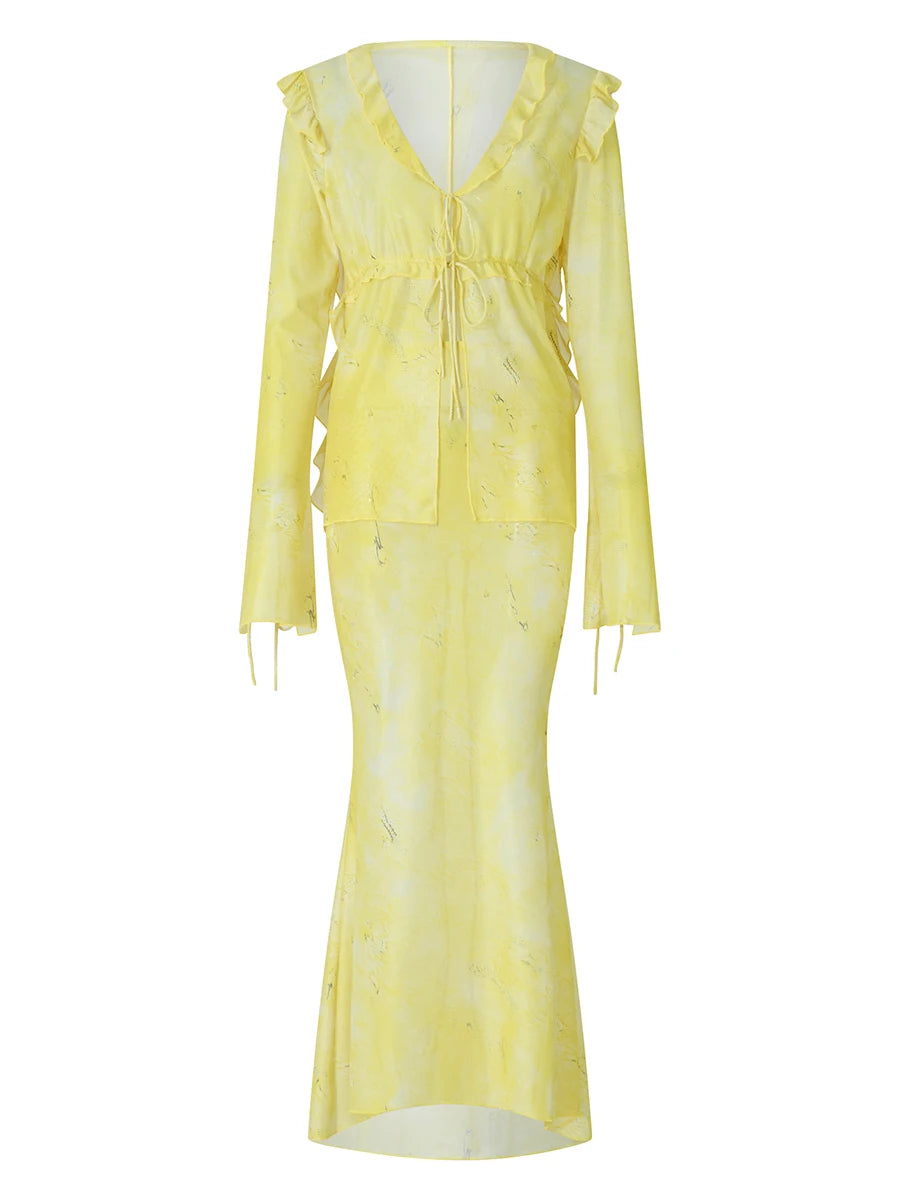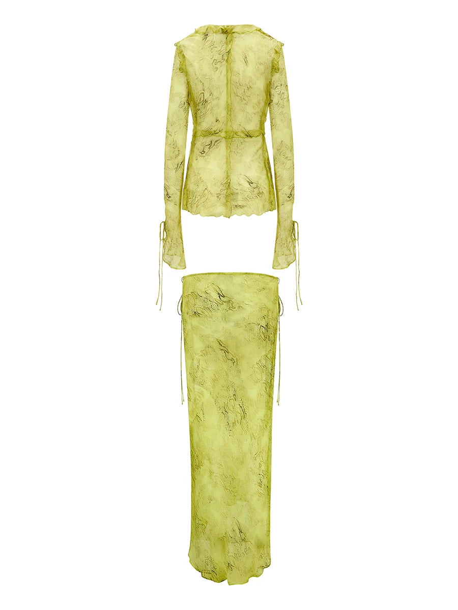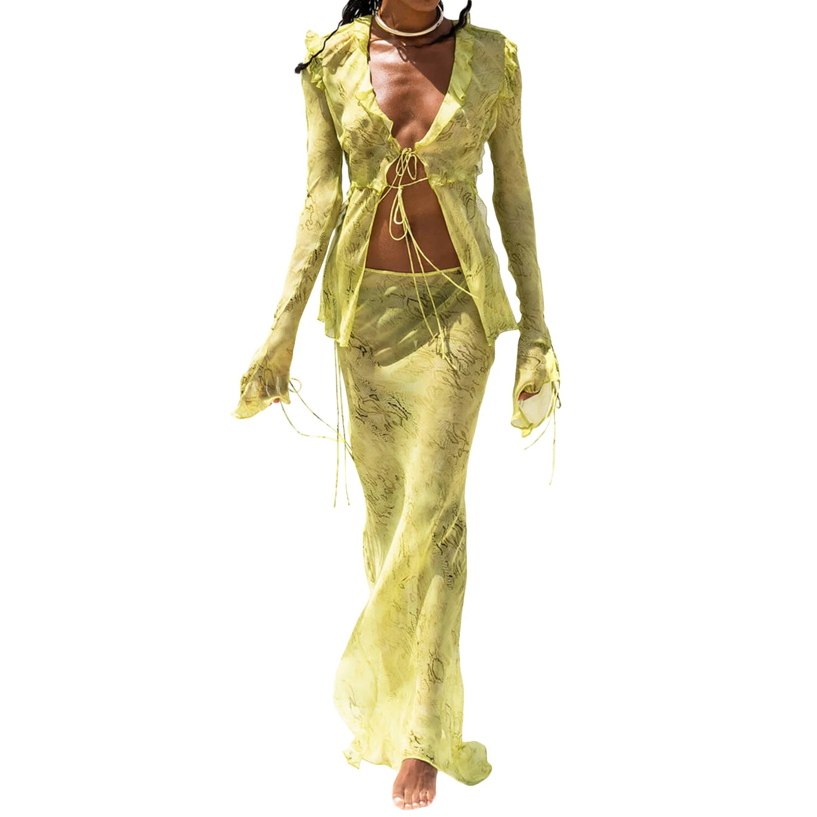 Womens Two Piece Summer Outfits, Tie-up Front Sheer Mesh Tops and Long Skirt SetFeatures: