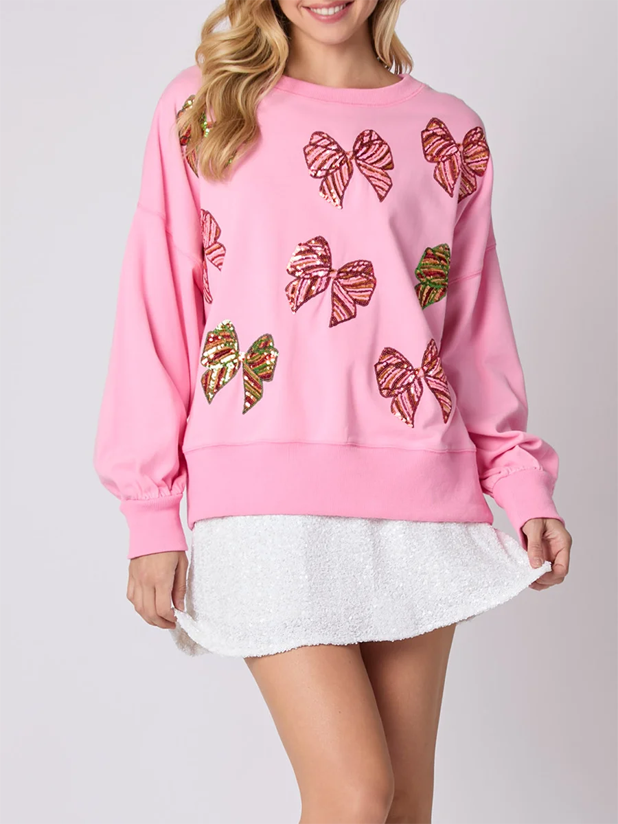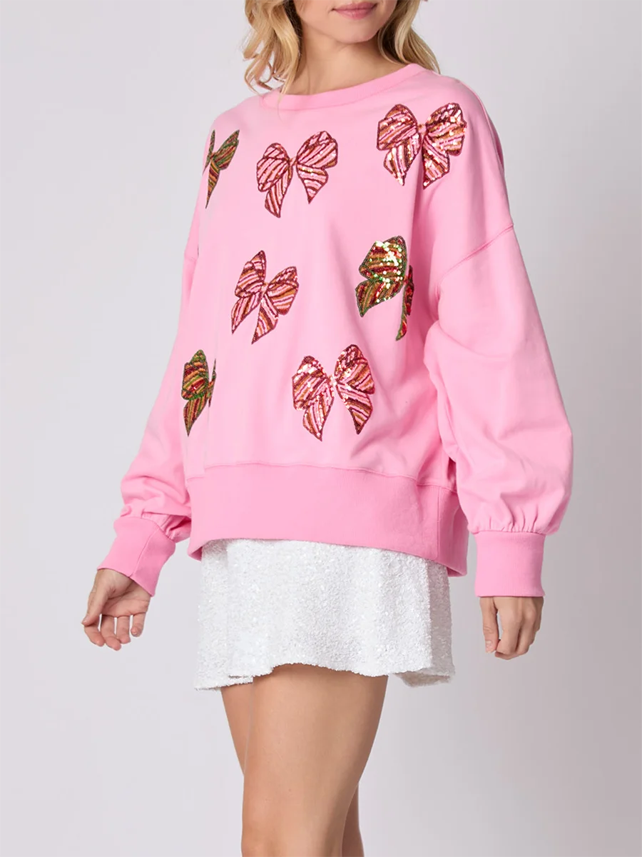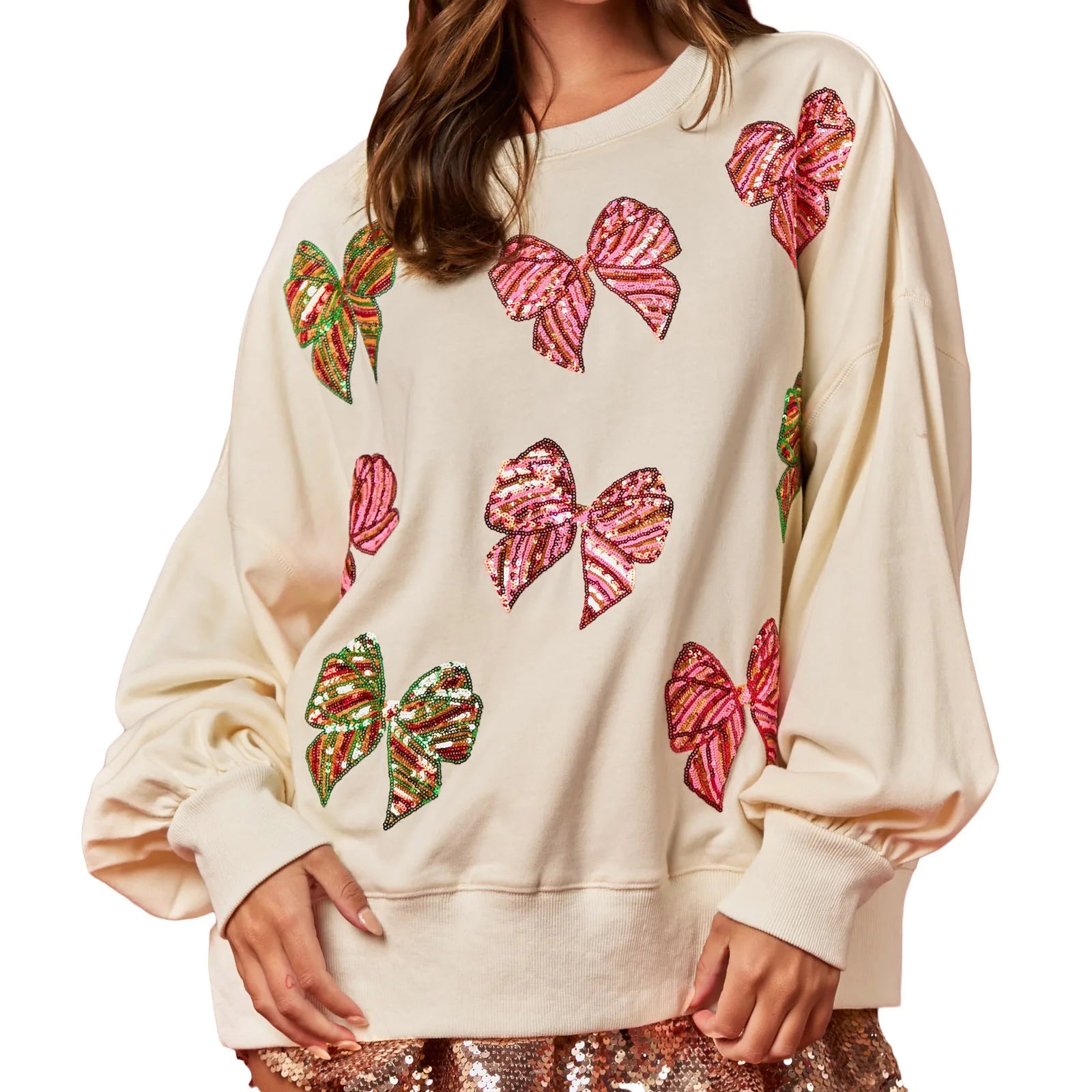 Women's Sequins Oversized Sweatshirt Bow Drop Shoulder Long Balloon Sleeve Round Neck Casual Tops