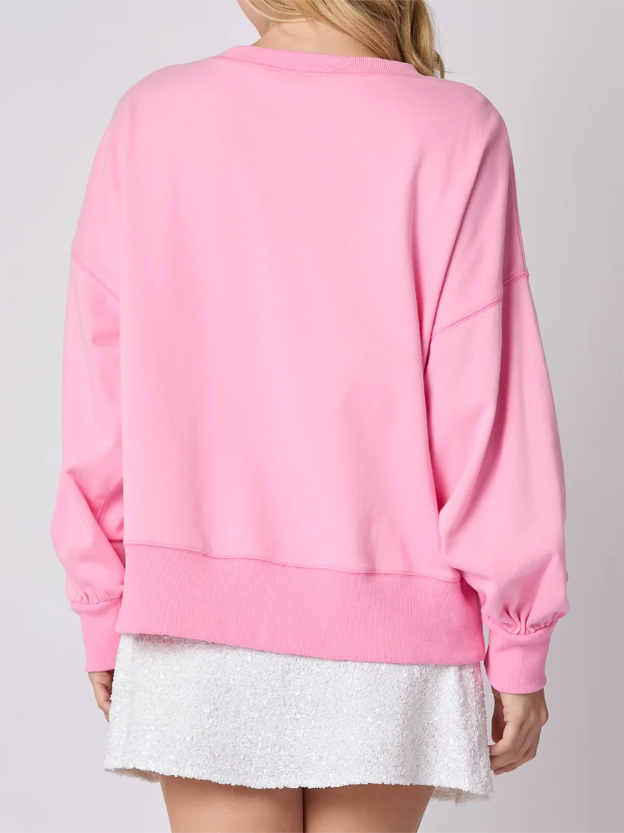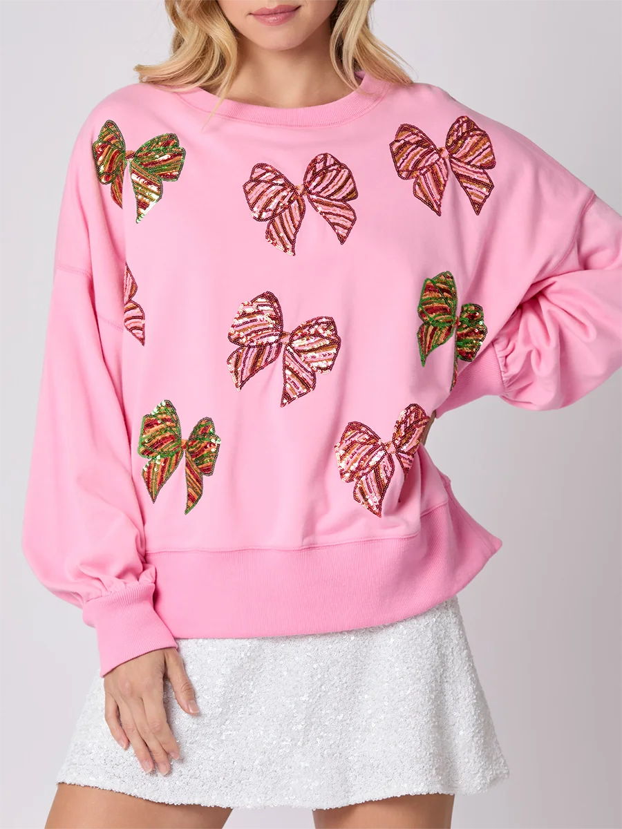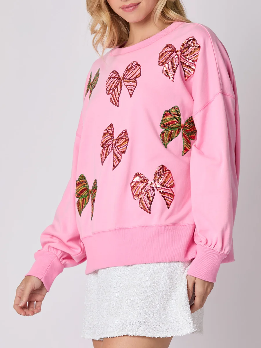 Women's Sequins Oversized Sweatshirt Bow Drop Shoulder Long Balloon Sleeve Round Neck Casual Tops