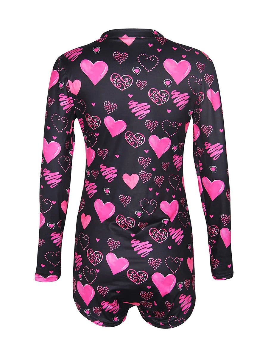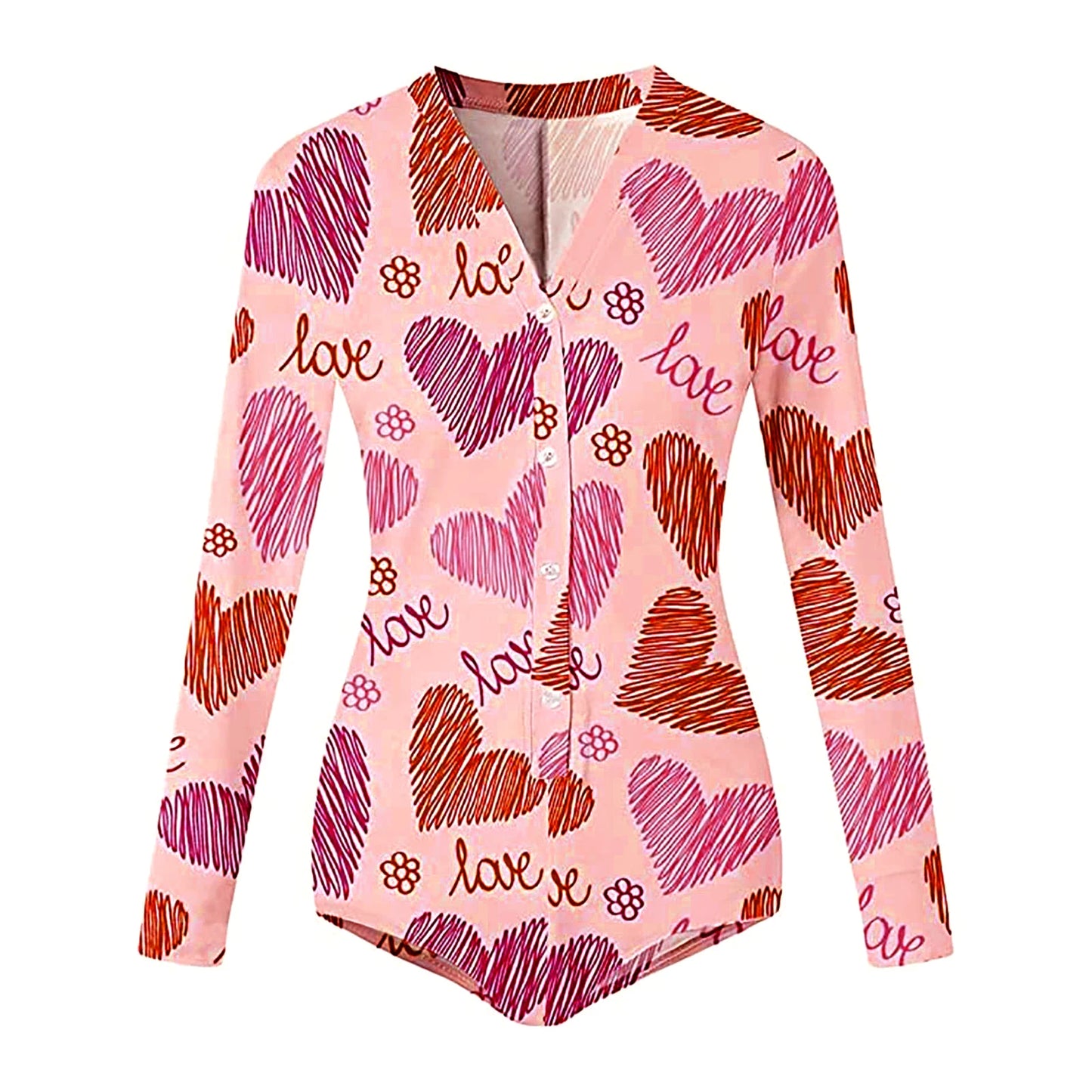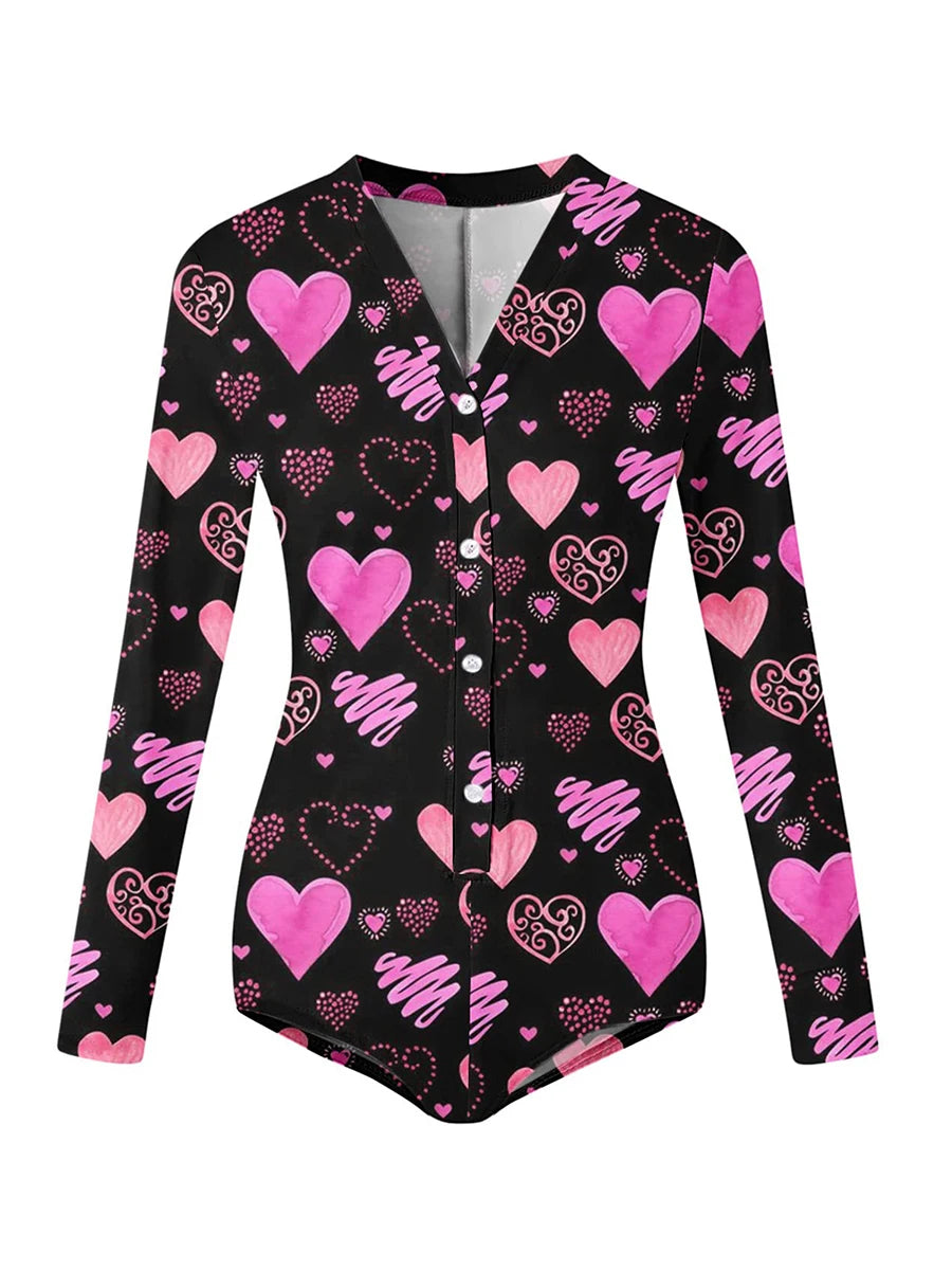 Womens Long Sleeve Valentine Day Jumpsuit Bodycon V Neck Heart Lip Print Button Down Short Romper Indoor Sleepwear