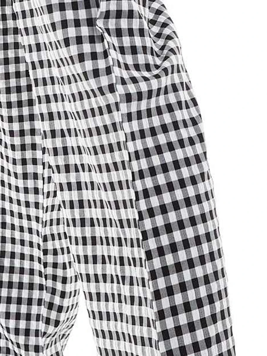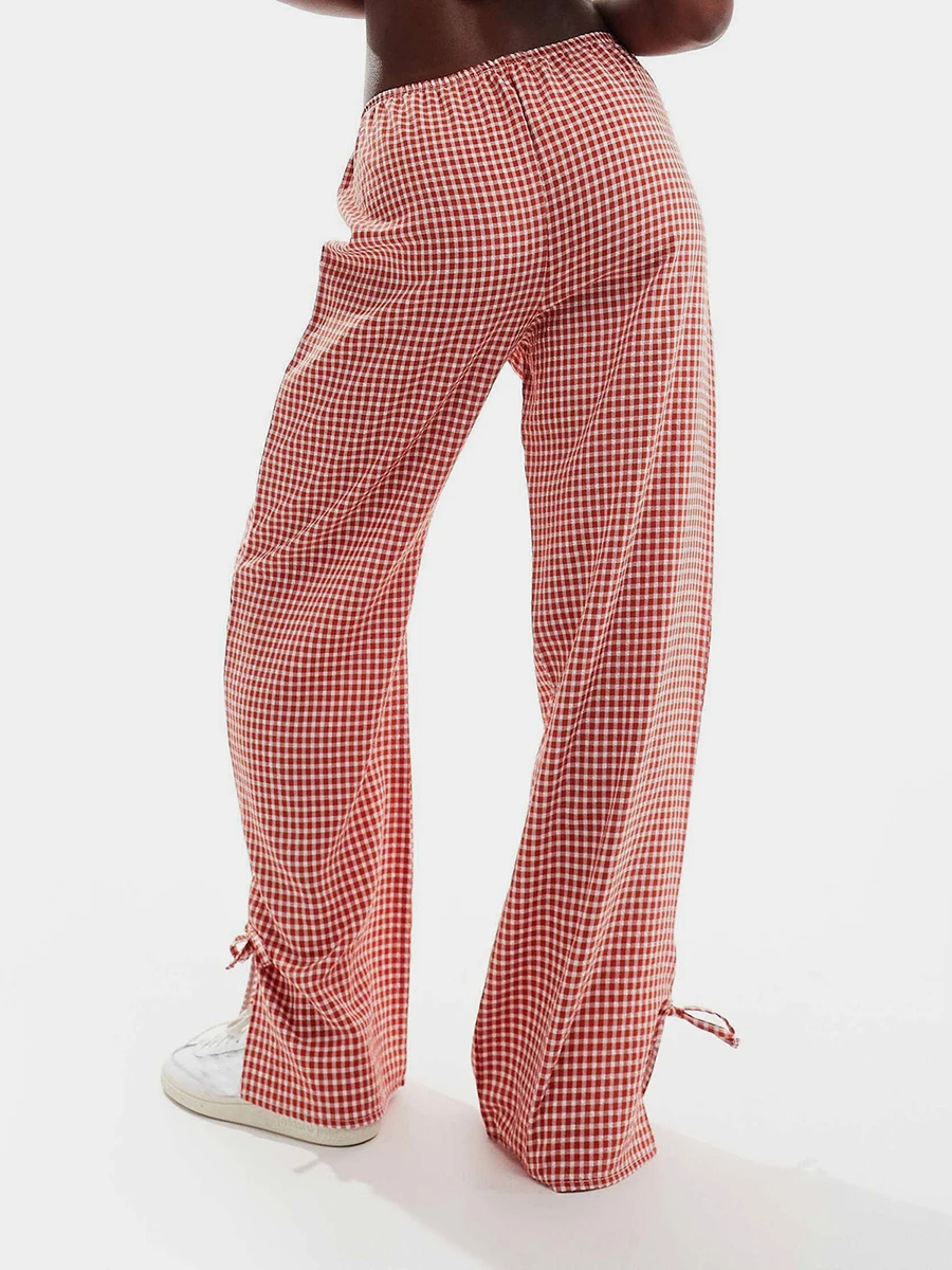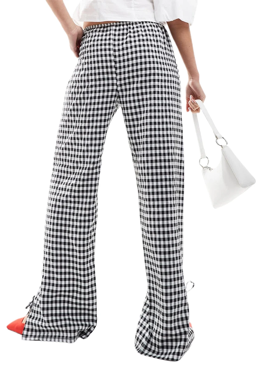 Women Plaid Print Pants Wide Leg Slit Tie-up Elastic Waistband Loose Casual Pull On Lounge Trousers