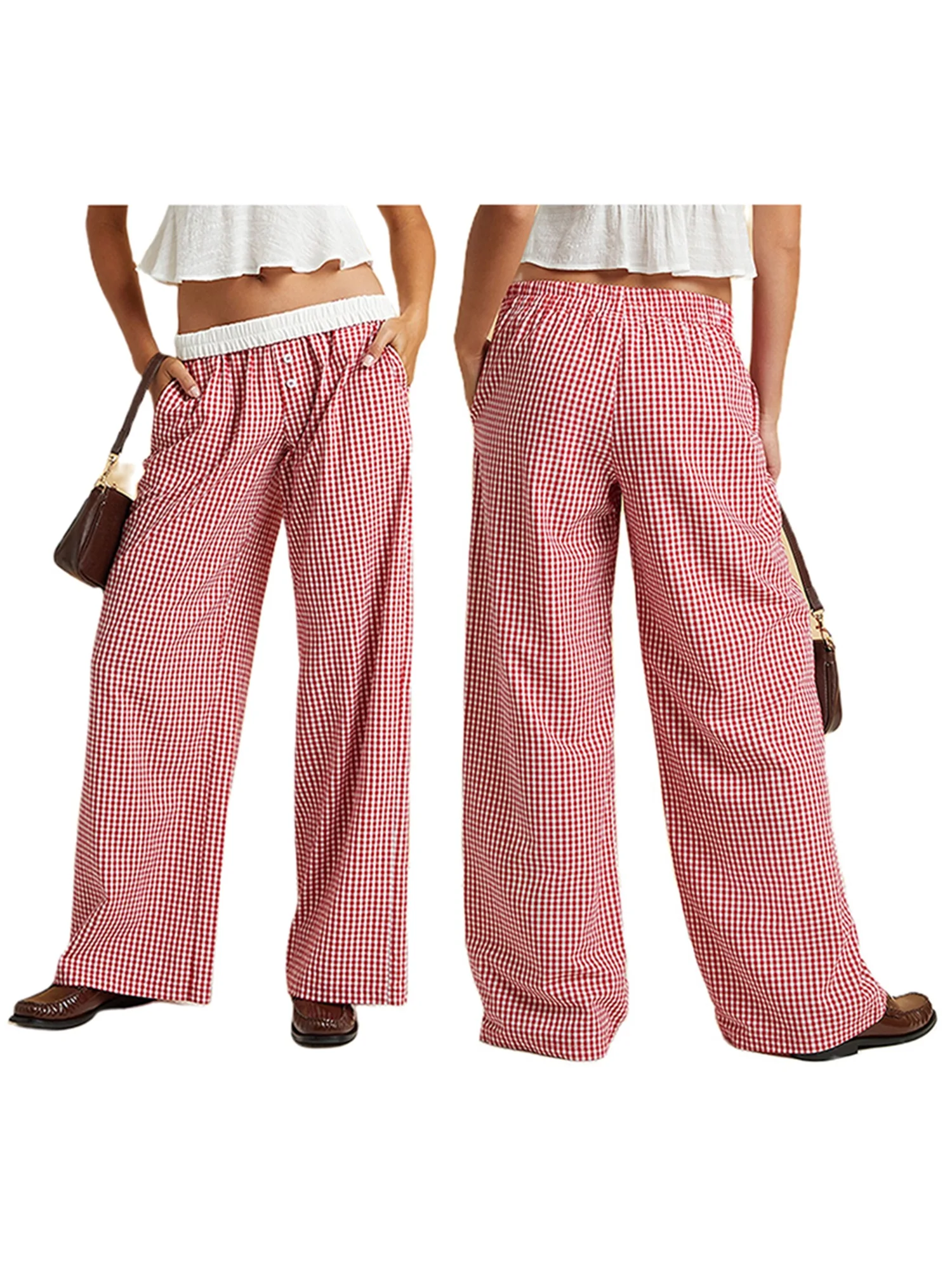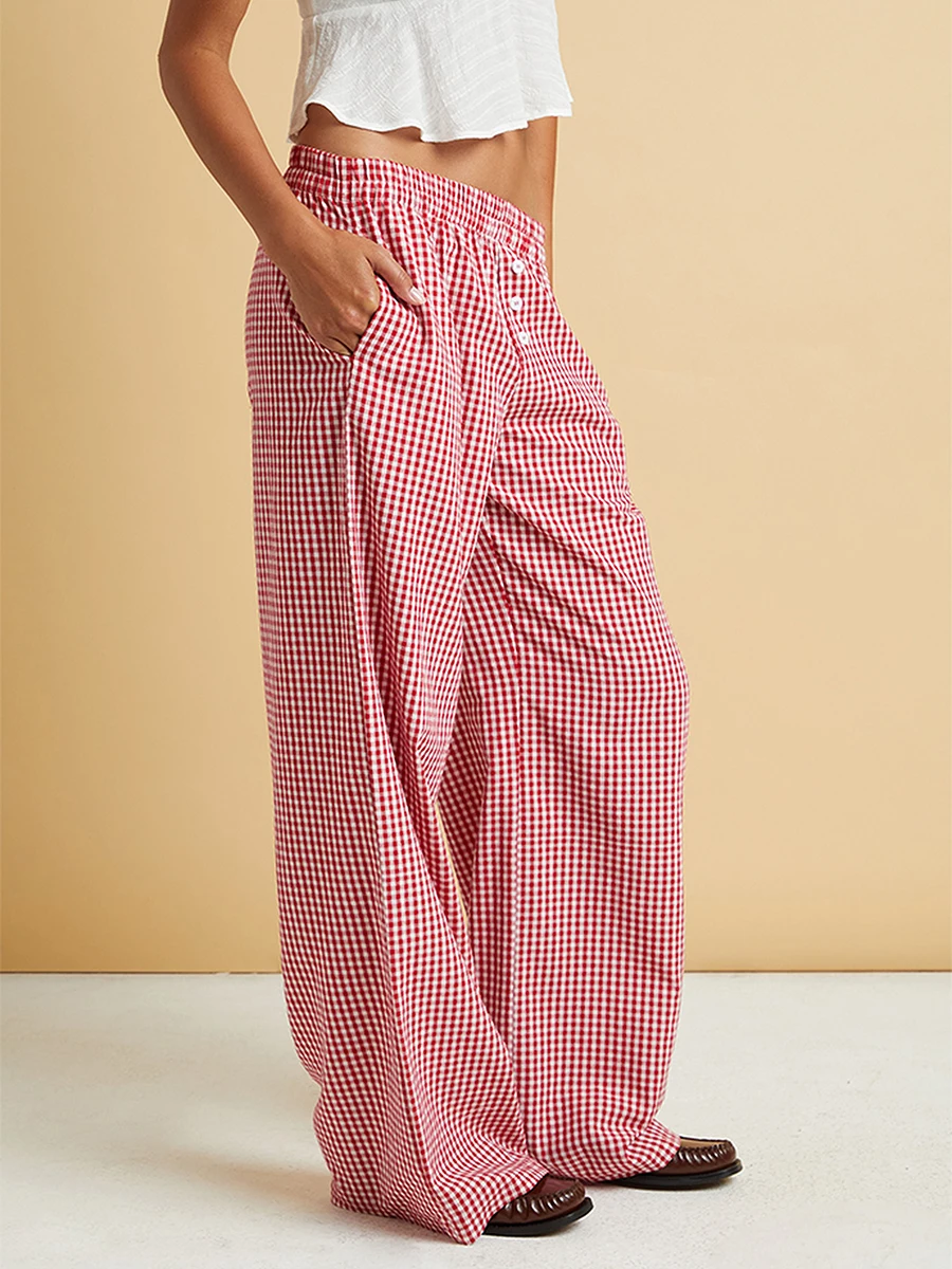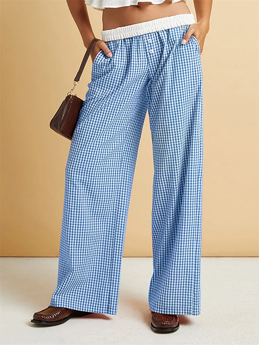 Women s Plaid Wide-Leg Pants with Button Detailing Elastic Waistband and Loose Fit for a Casual Spring Summer Look - Stylish