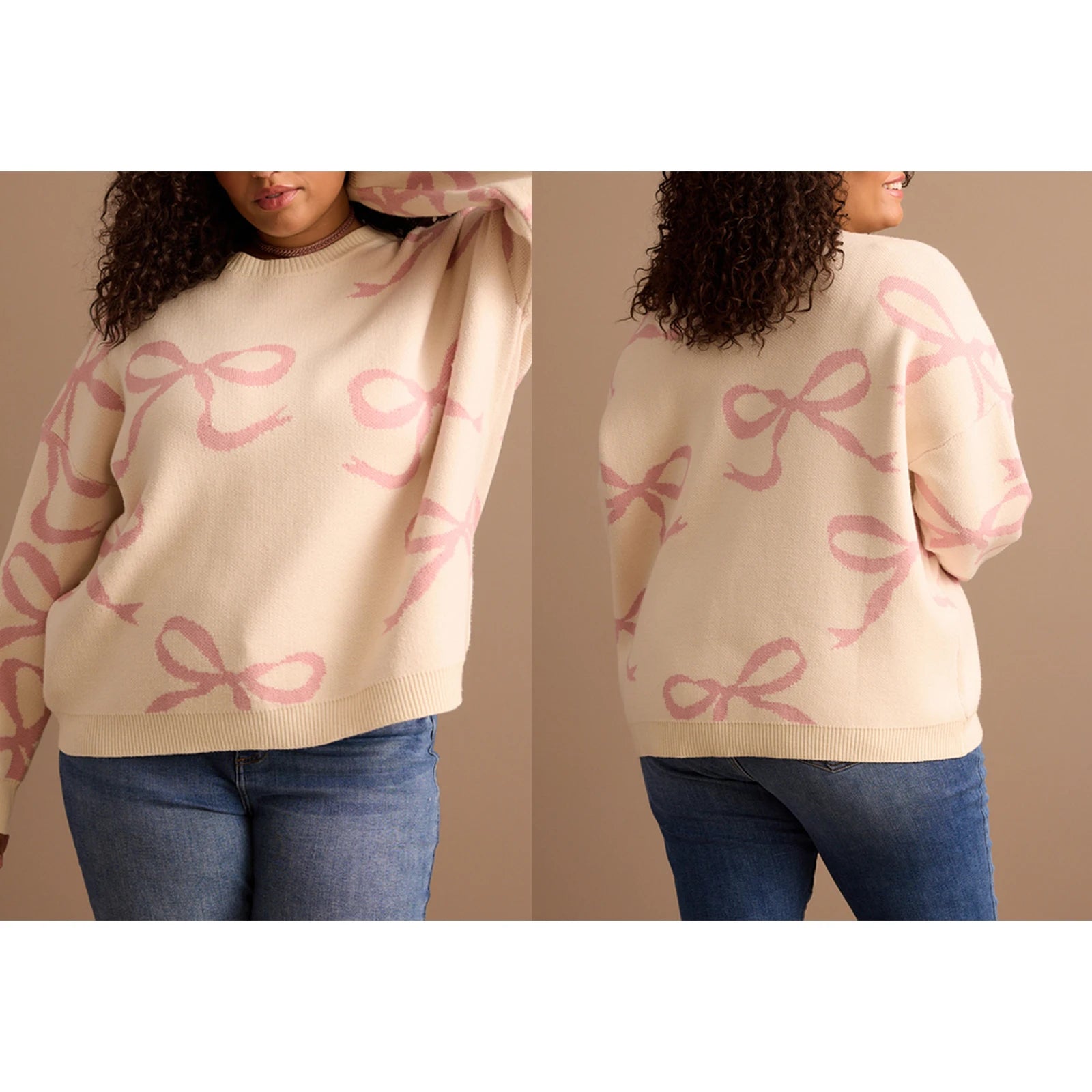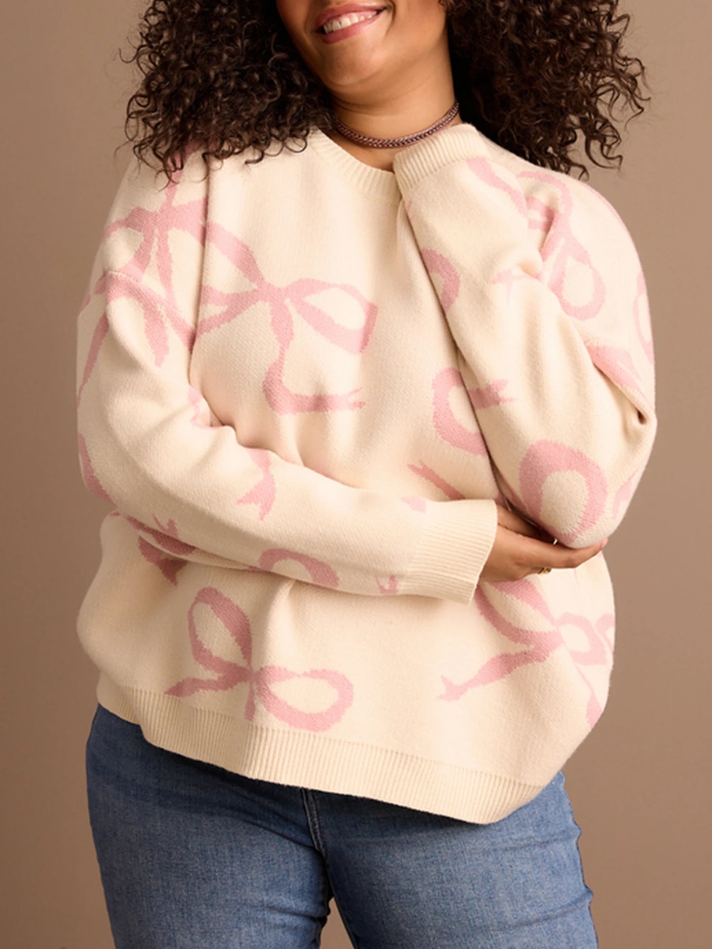 Women's Plus Size Sweater Bow Print Crew Neck Long Sleeve Pullover Knit Tops Casual Streetwear for Winter Fall