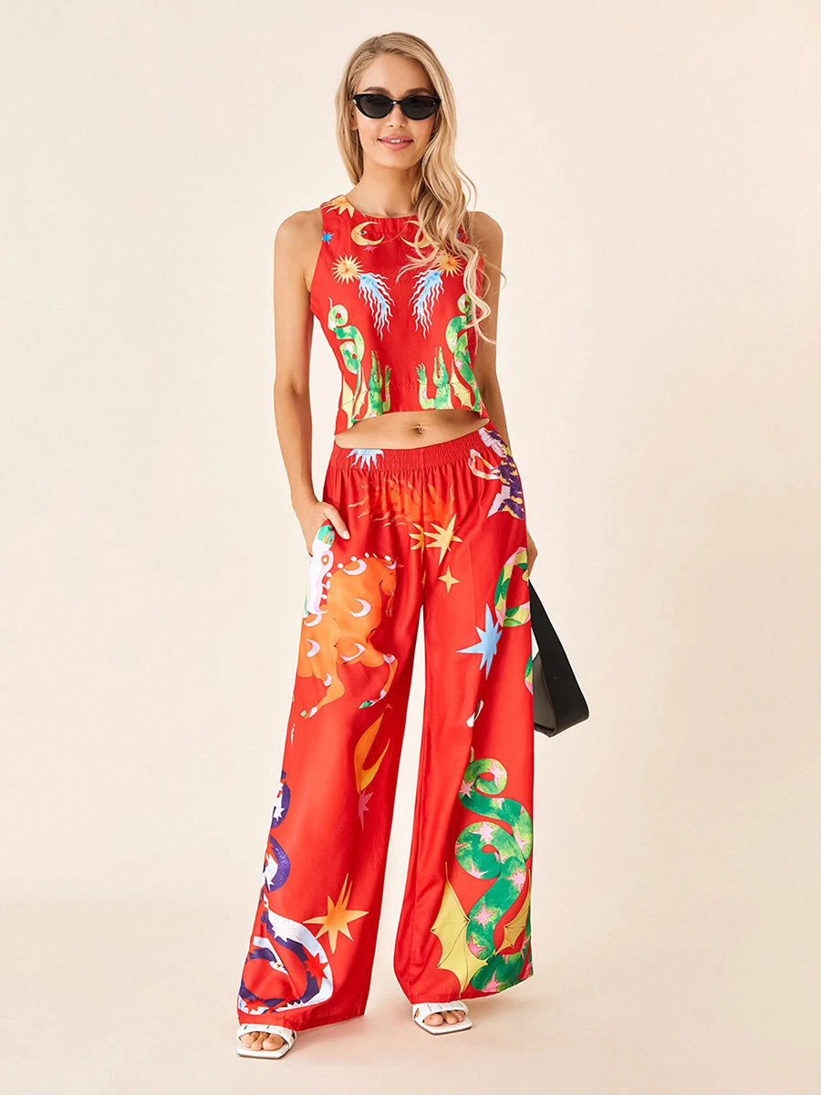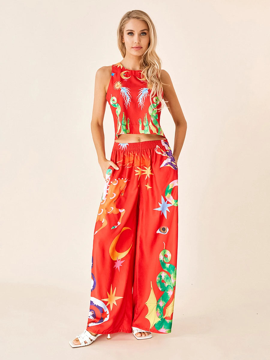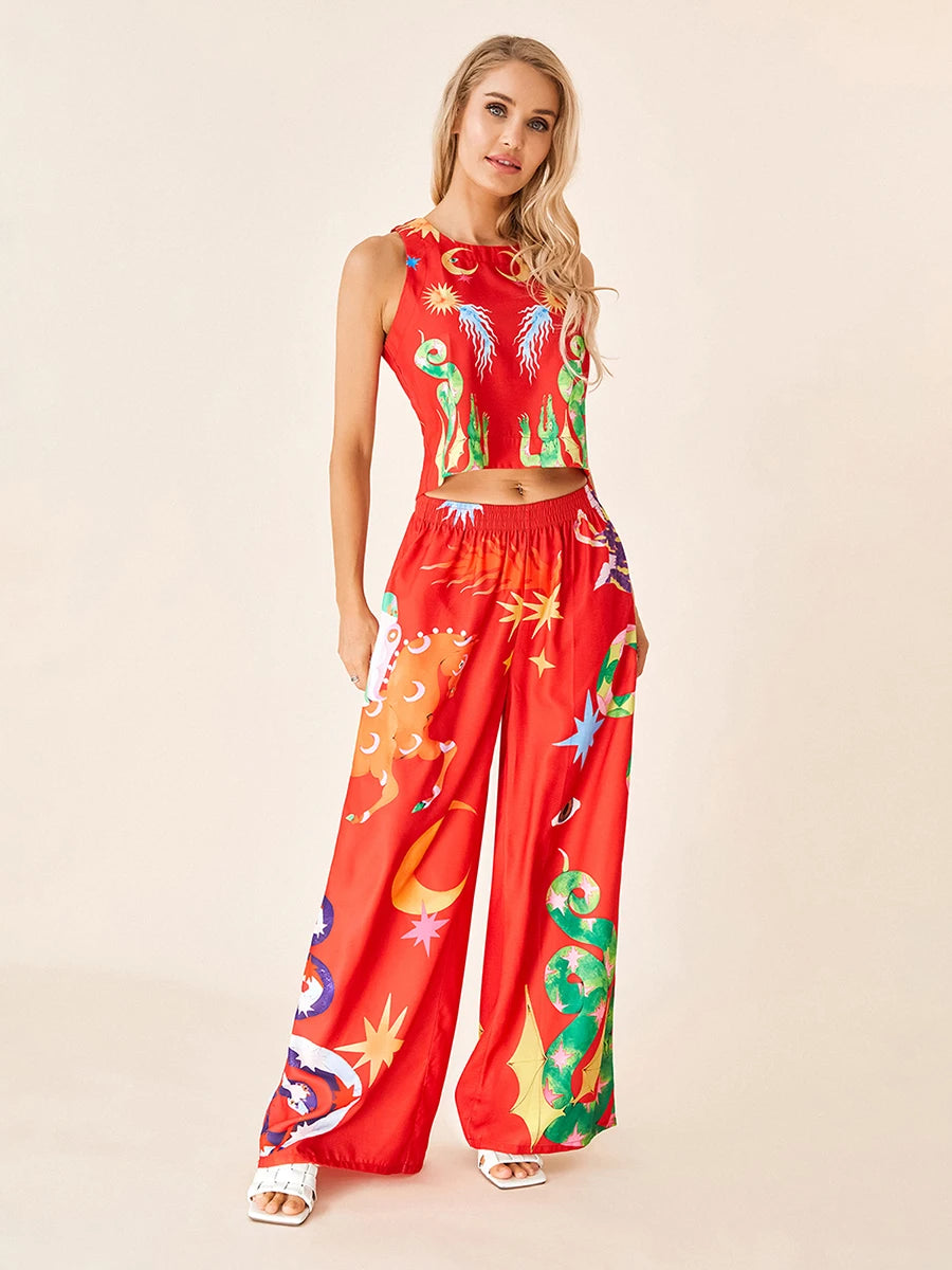 Women s Retro Style Crop Top and High Waisted Wide Leg Pants Set with Abstract Print Sleeveless Tank Top and Loose Fit