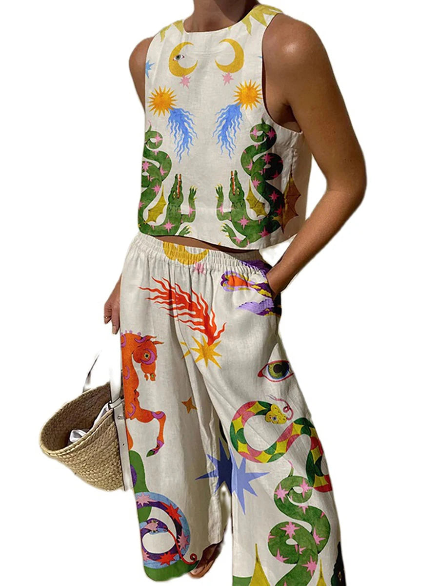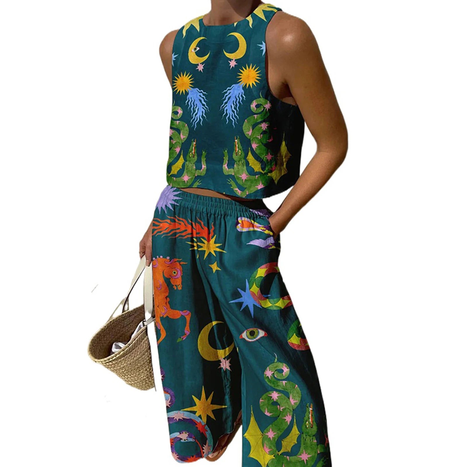 Women Vintage Pants Set Graphic Print Sleeveless Tank Tops and Loose Fit Pants Outfits Summer 2 Piece Loungewear
