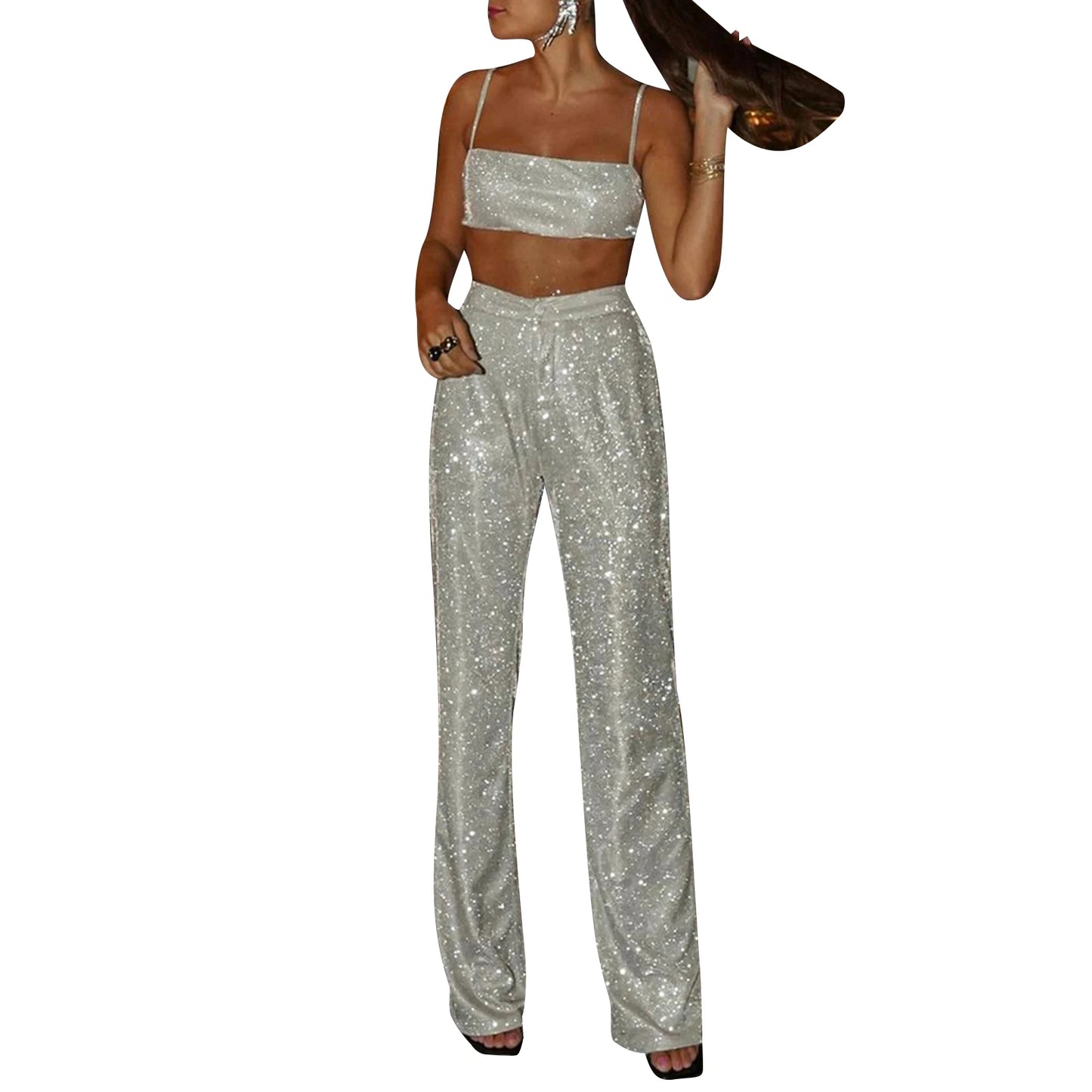 Women s Sleeveless Tank Top and Skinny Pants Set High Waist Spaghetti Strap Outfit with Shiny Metallic Finish Stretchy