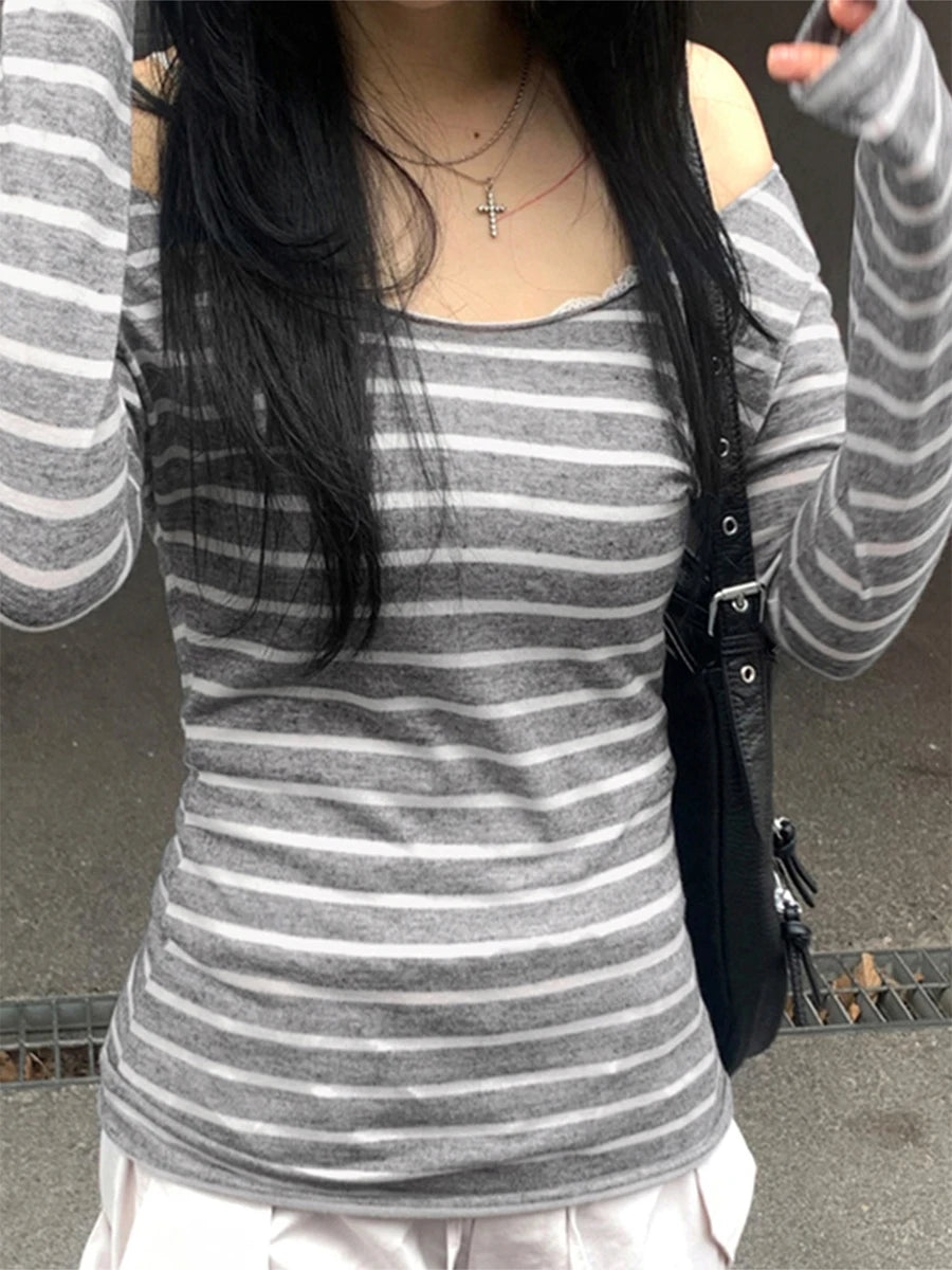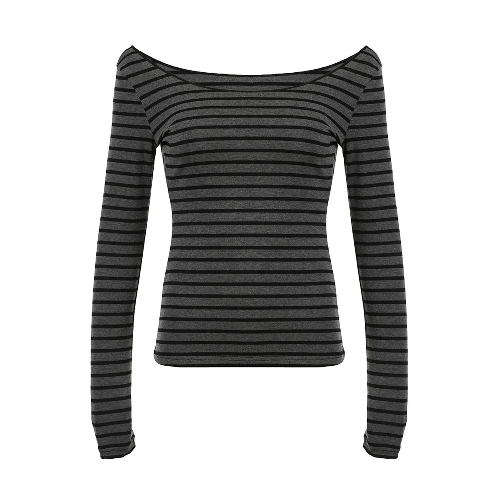 Women's Off Shoulder Tops Striped Long Sleeve Casual T-Shirt for Fall Streetwear