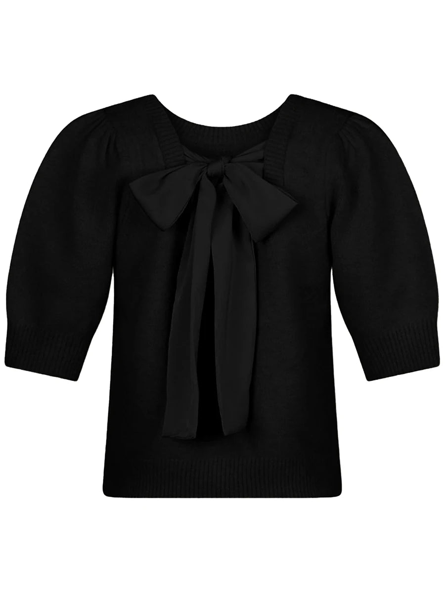 Women's Spring Autumn Knit Sweaters Half Sleeve O Neck Solid Color Bow Decor Casual Knitwear