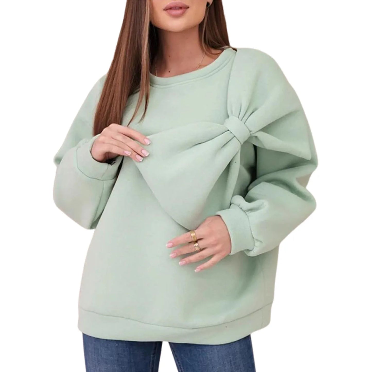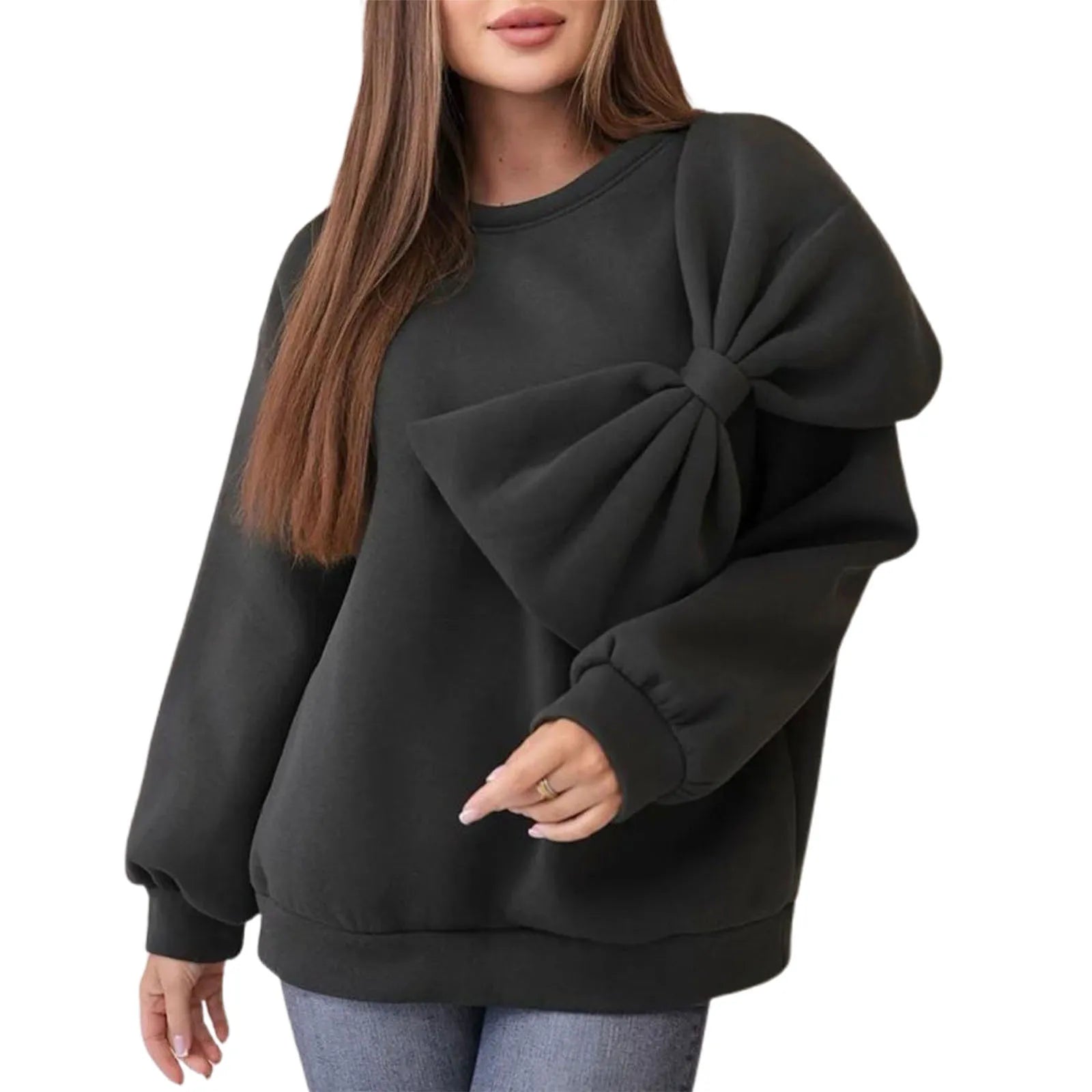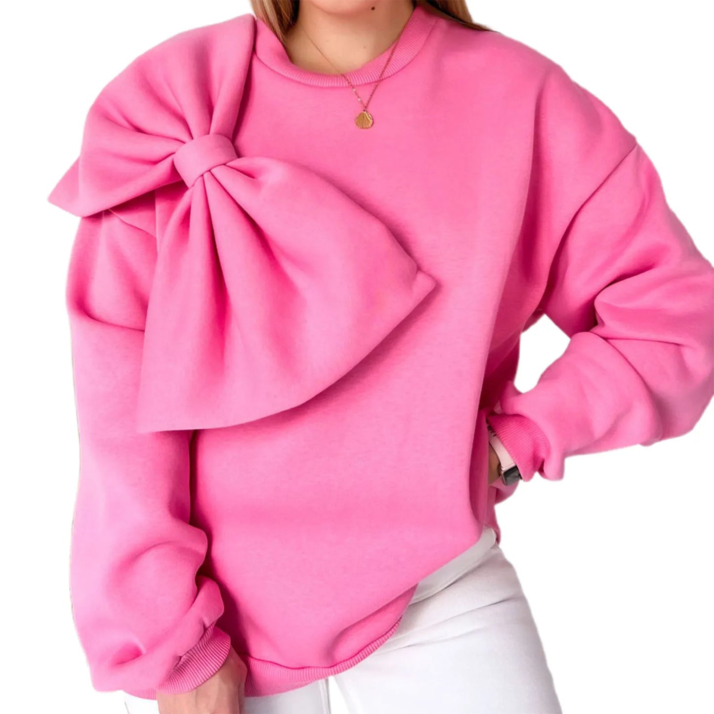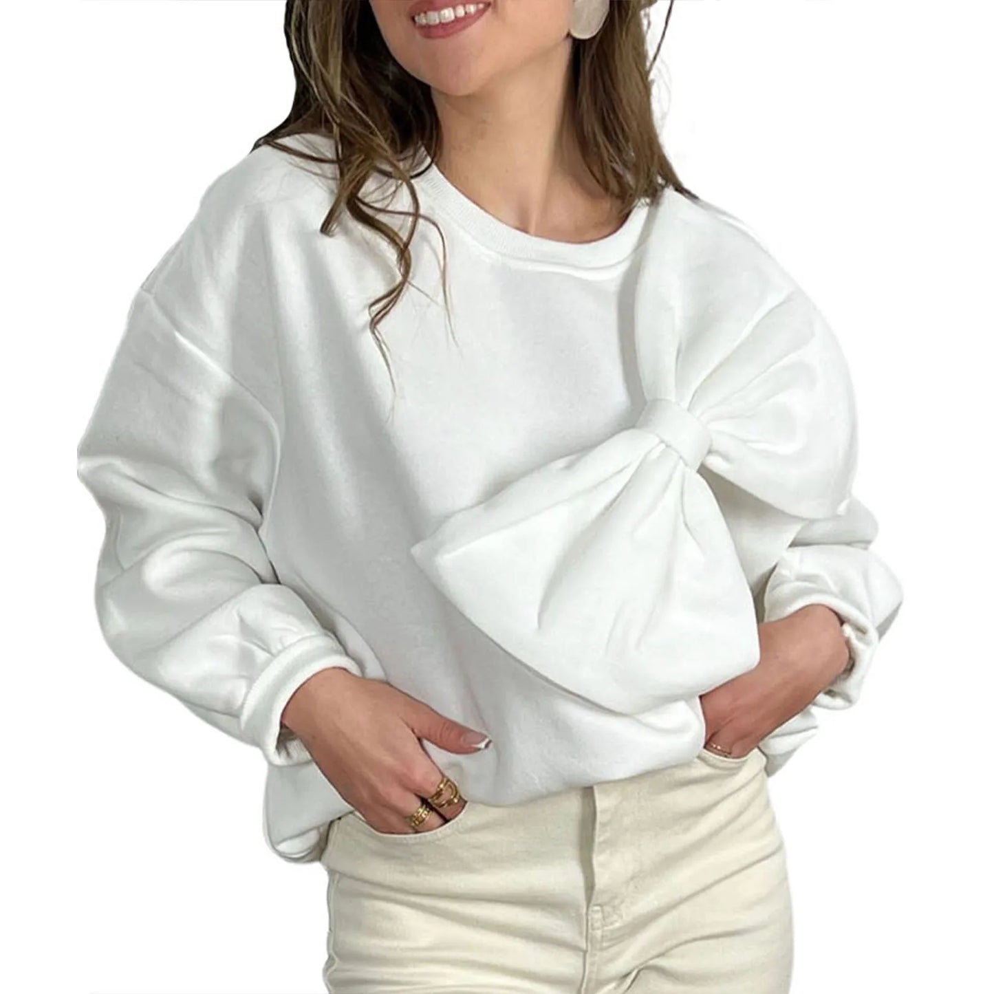 Women's Fall Loose Pullover Cute 3D Bowknot Solid Color Long Sleeve Crew Neck Sweatshirt