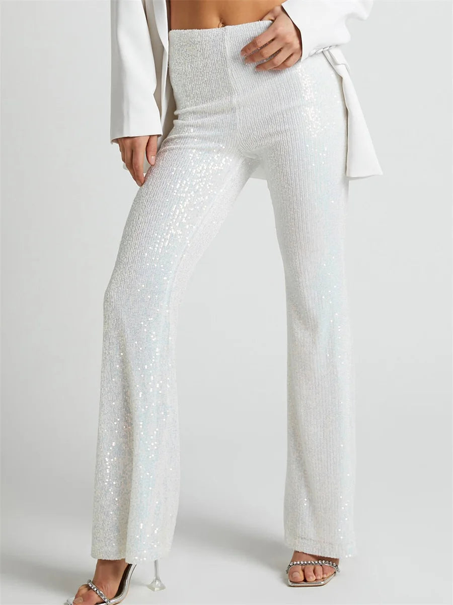 Women Sequin Embellished High Waist Flare Pants Long Trousers