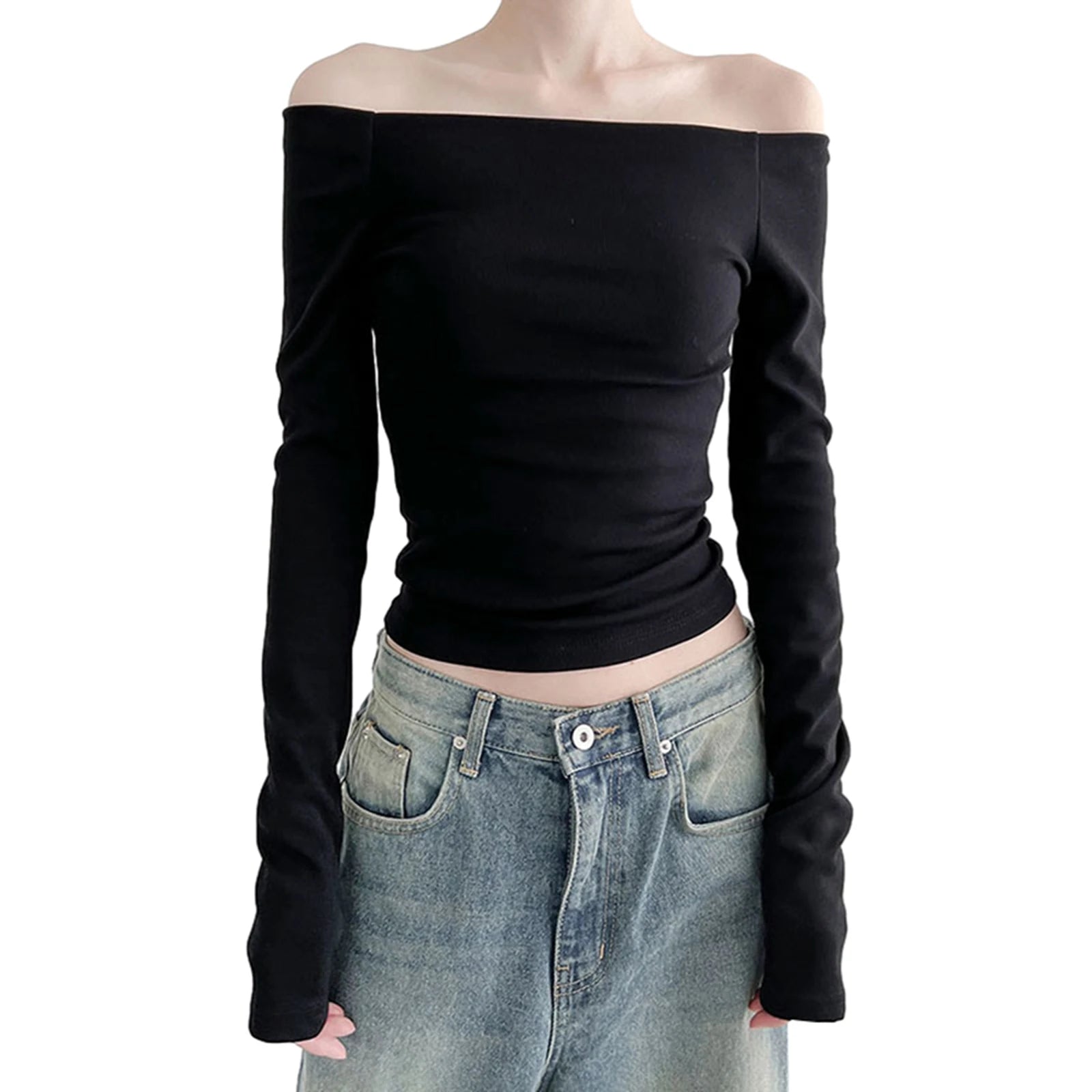 Women Solid Color Short T-Shirt Boat Neck Long Sleeve Off Shoulder Shirts Spring Fall Fit Tops Streetwear