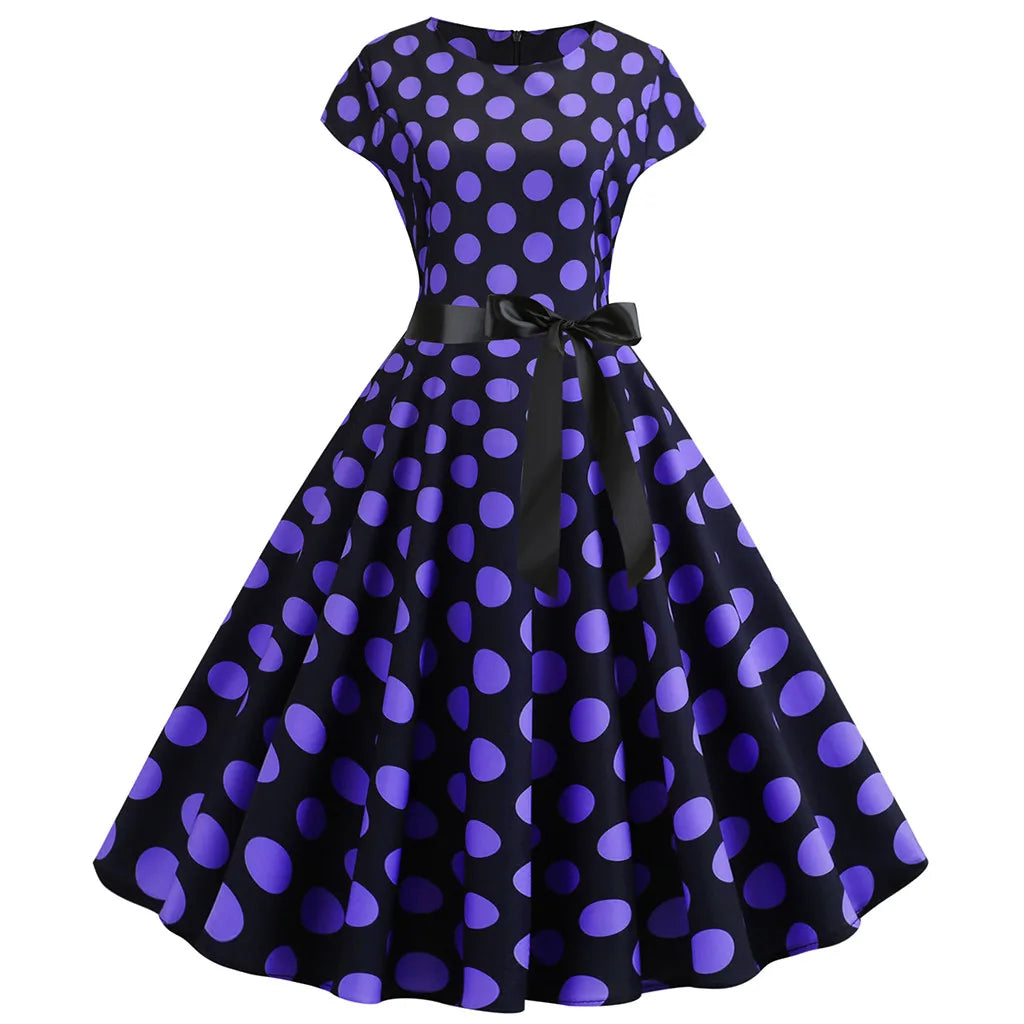 Women Vintage 1950s Retro Short Sleeve Dot Print Evening Party Prom Swing Dress