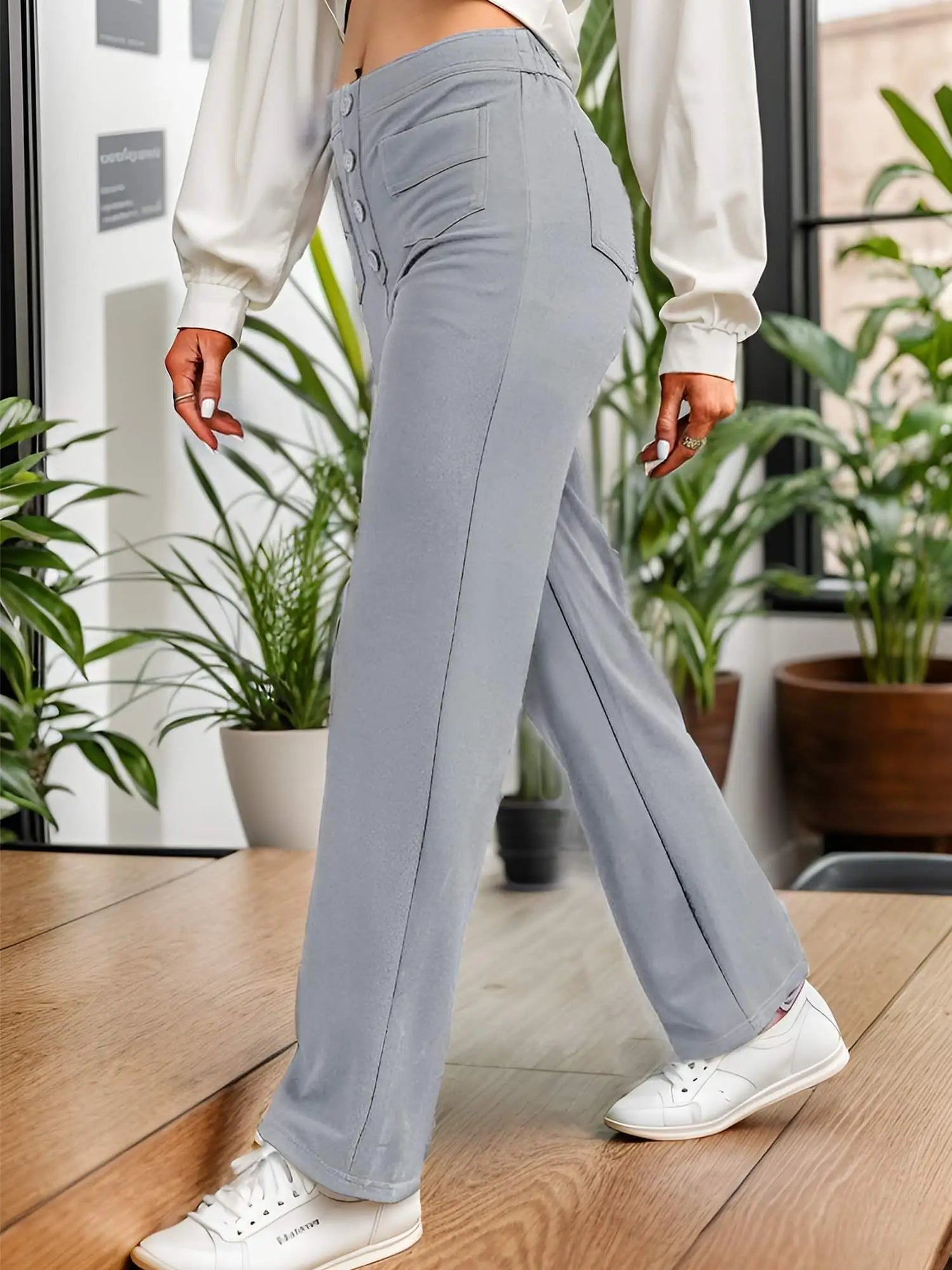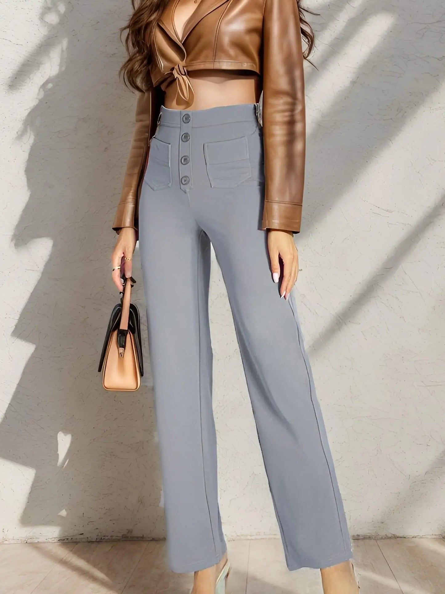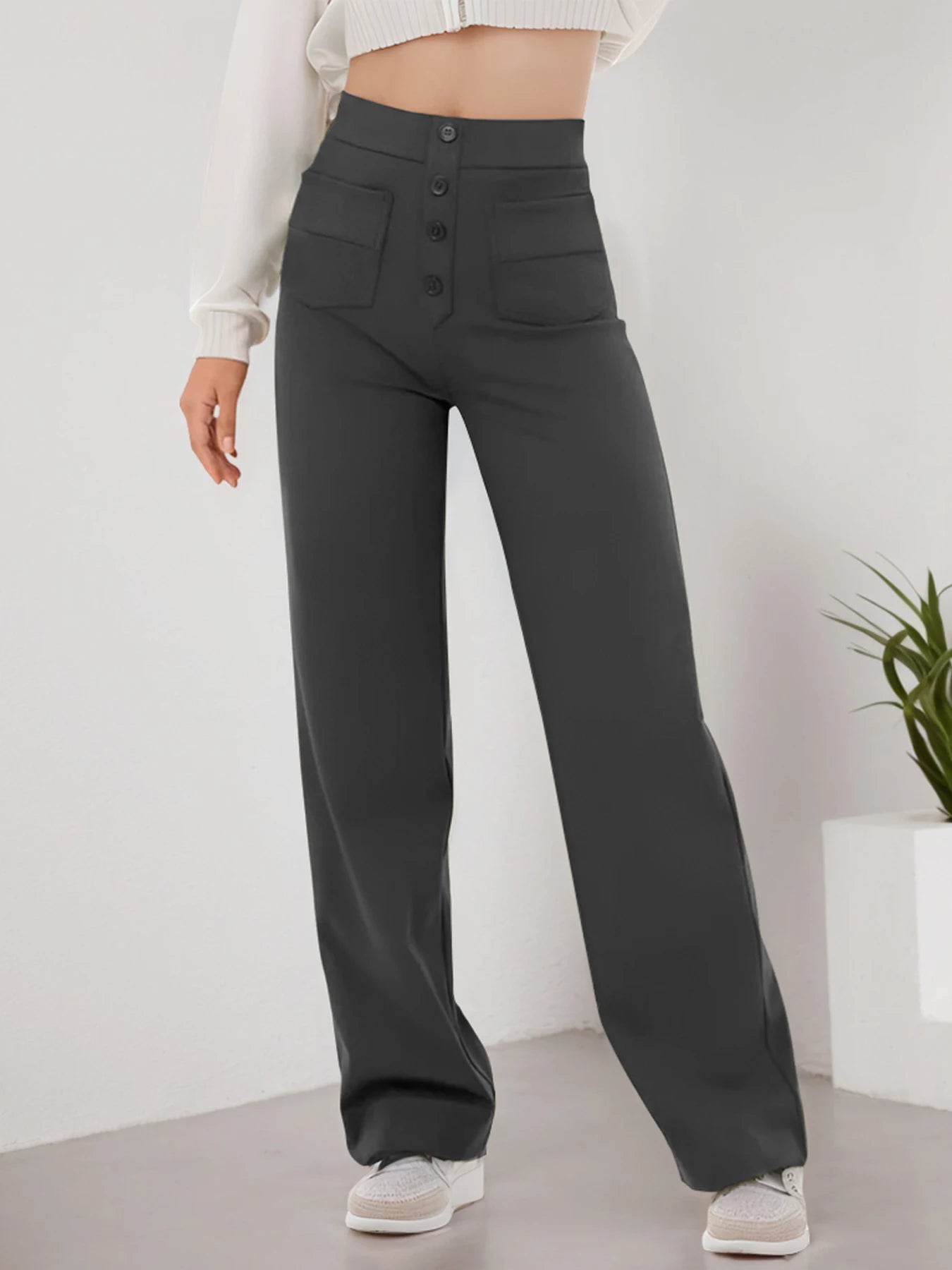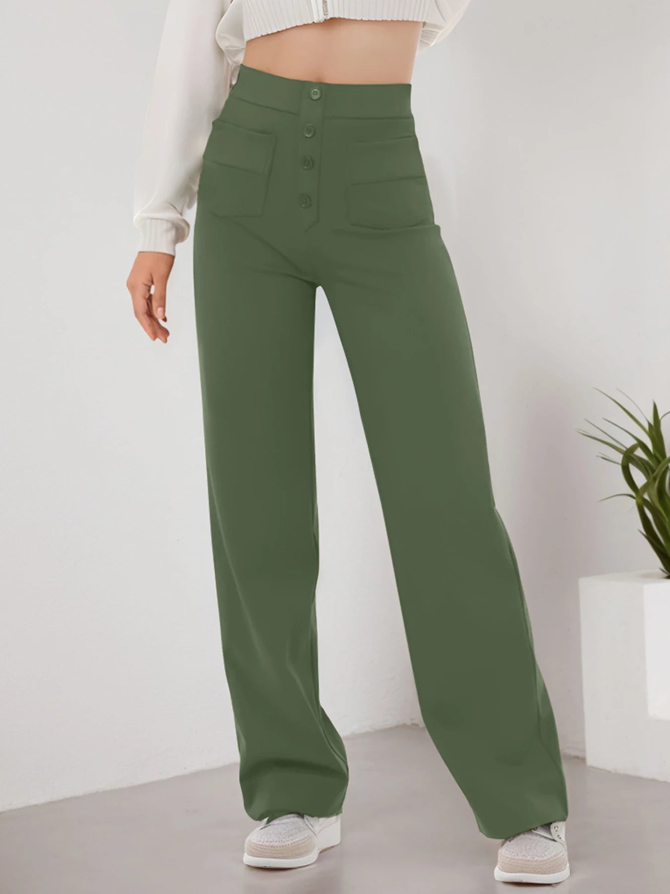 Women's Casual Straight Leg Pants High Waisted Button Down Stretchy Trousers with Multiple Pockets