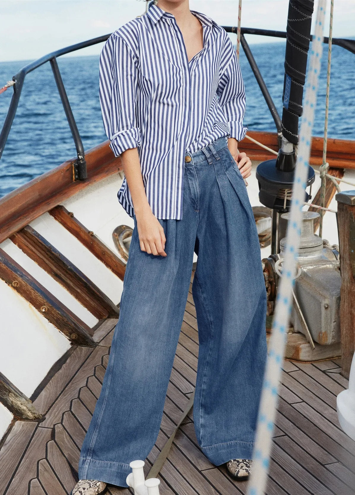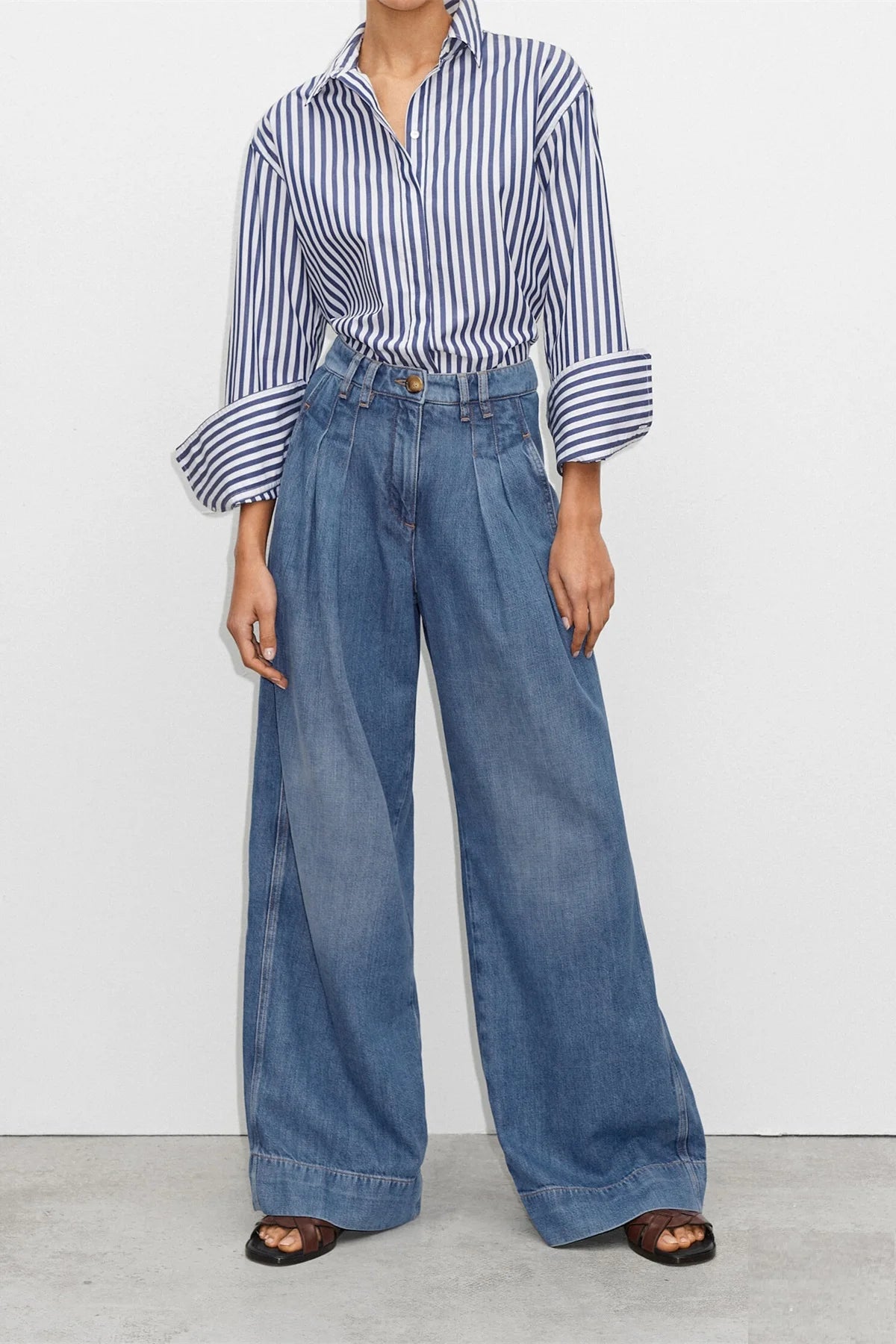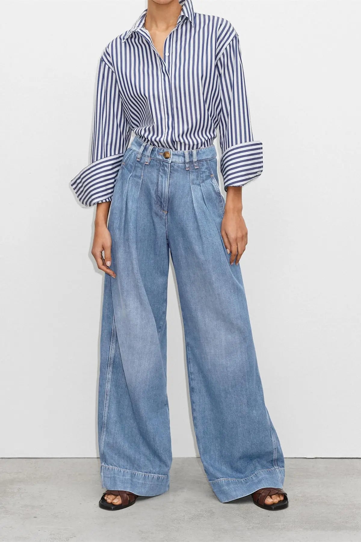 Achieve effortless style with these high-waist wide-leg jeans, designed for a relaxed yet trendy look. Made from slightly stretchy thin denim cotton, these full-length jeans provide a loose fit for ultimate comfort and breathability. With a minimalist design and no extra decoration, they offer a clean and versatile aesthetic perfect for casual wear or street-style outfits. The high-waisted cut enhances the silhouette, making them easy to pair with crop tops, oversized shirts, or fitted blouses for a chic, laid-back vibe. A must-have staple for every denim lover!