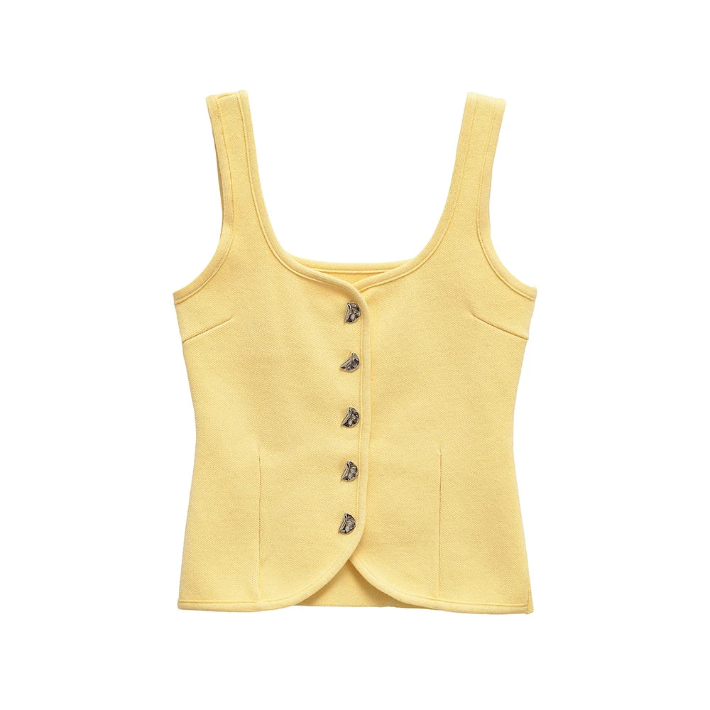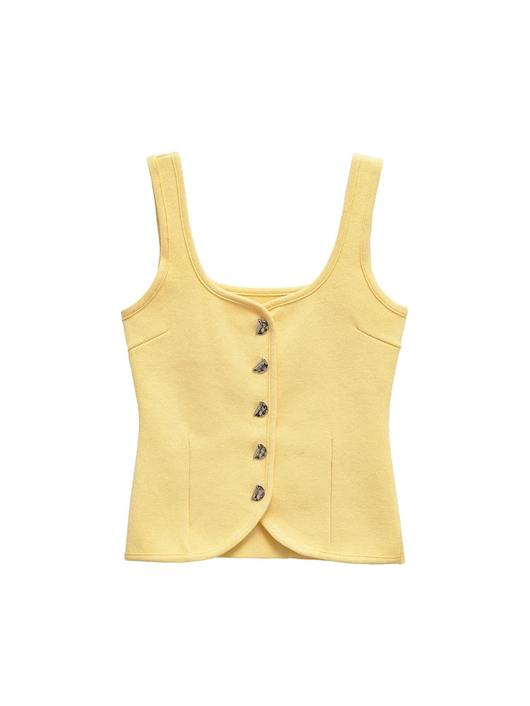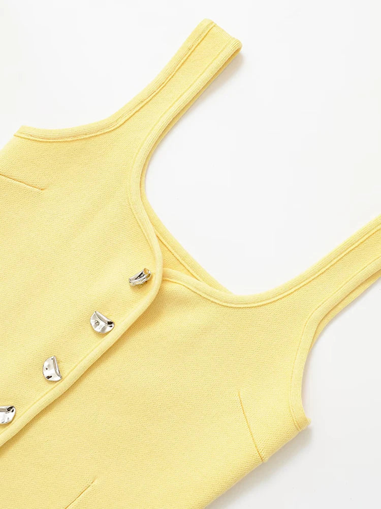 Women's Fashion With Metal Buttons Knit Vest Sweater O-Neck Wide Straps Waistcoat Chic Tops