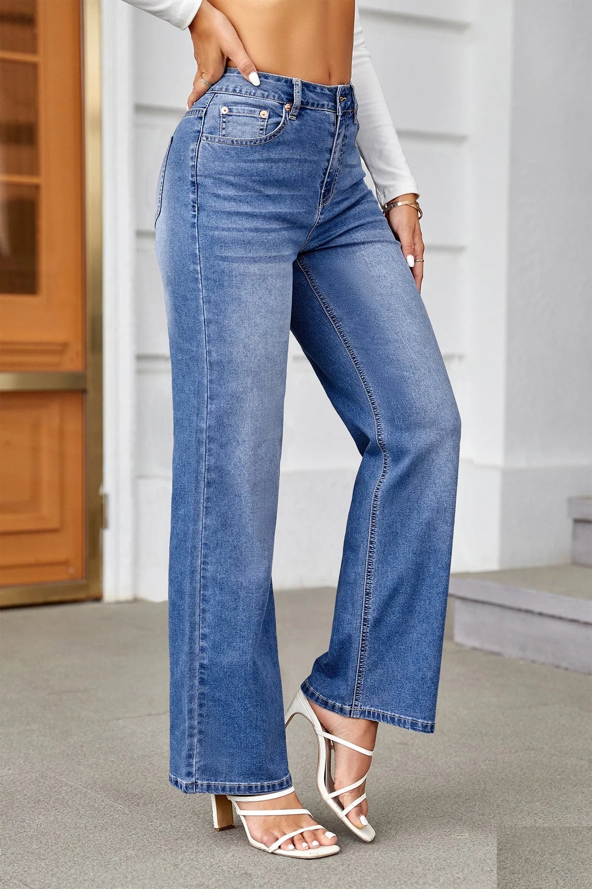 Embrace comfort and style with these high-waist straight-leg jeans, designed for a relaxed yet flattering look. Made from a blend of cotton and spandex, these jeans offer slight stretch for a comfortable fit while retaining their structure. The loose fit provides a laid-back silhouette, perfect for all-day wear, while the full-length design makes them versatile for pairing with any shoes, from sneakers to heels. Ideal for casual styling, these jeans can be dressed up or down, making them a staple for any wardrobe.