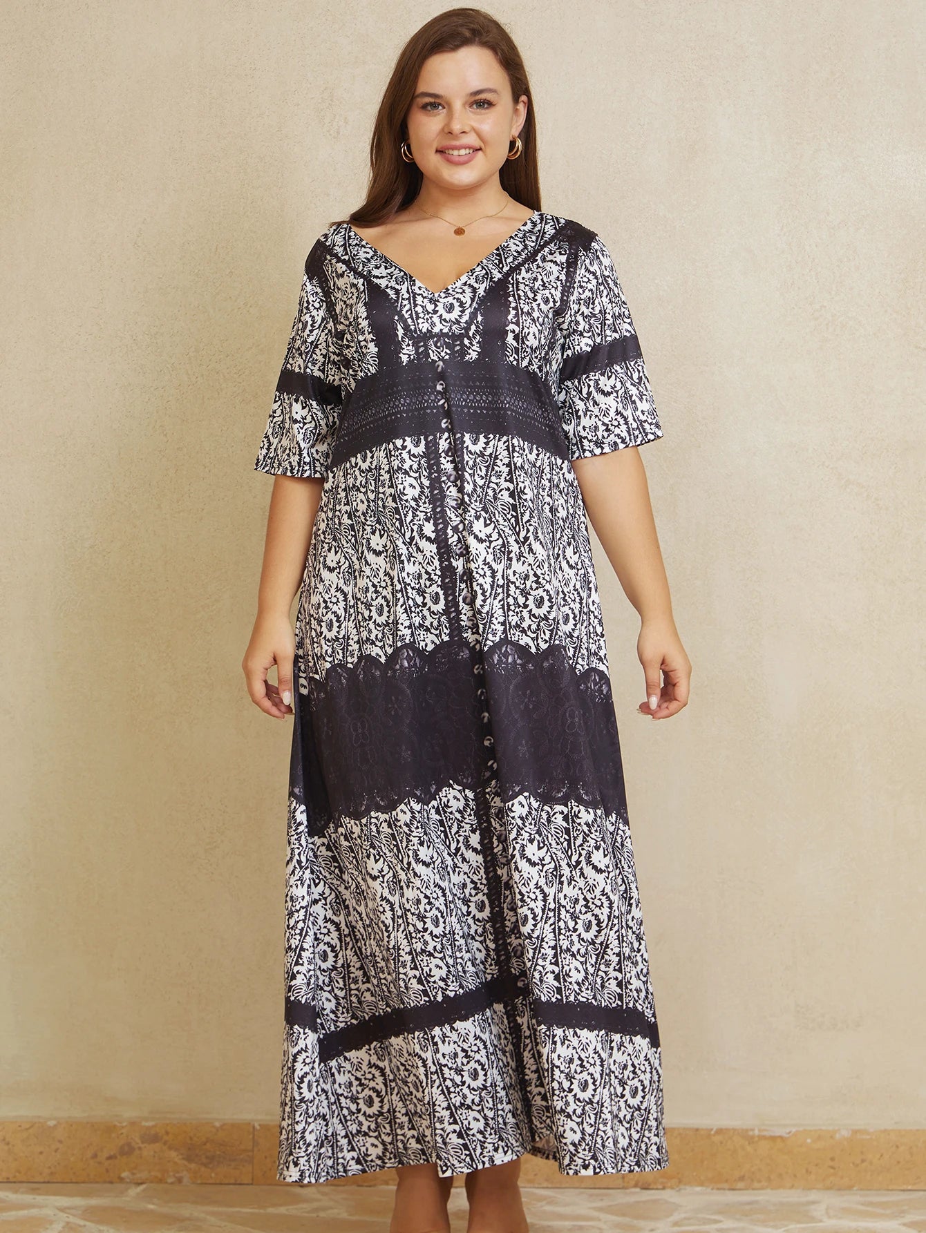 Women's loose floral print V-neck plus size dress, spring and summer casual fashion short-sleeved dress, women's plus size cloth