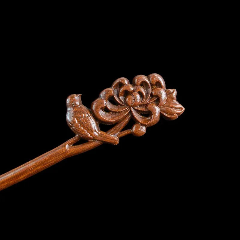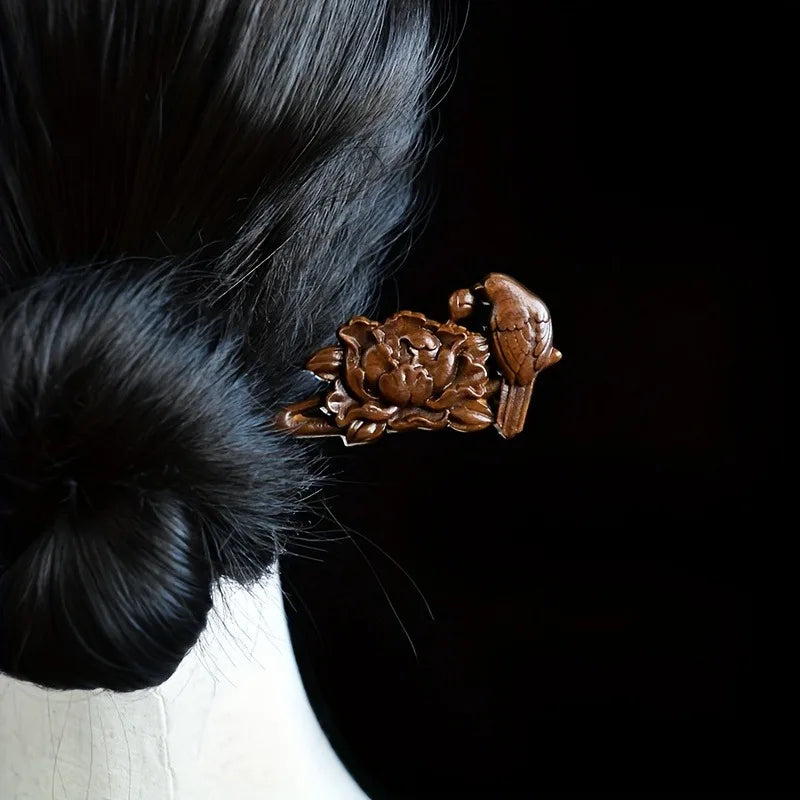 Women's Luxurious Wood Carved Hair Accessory Elegant Collar Bird Peony Carving Suitable for Daily Gatherings Solid Wood Hairpin
