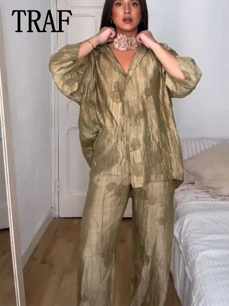 Women's Print Long Pants Sets Lapel Half Sleeve Single Breasted Shirts + High Waist Lace-Up Wide Leg Pants