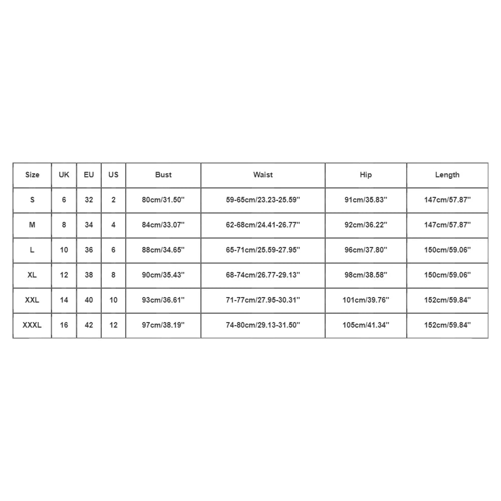 | Size:XXL | UK:14 | EU:40 | US:10 | Bust:93cm/36.61'' | Waist:71-77cm/27.95-30.31'' | Hip:101cm/39.76'' | Length:152cm/59.84'' |