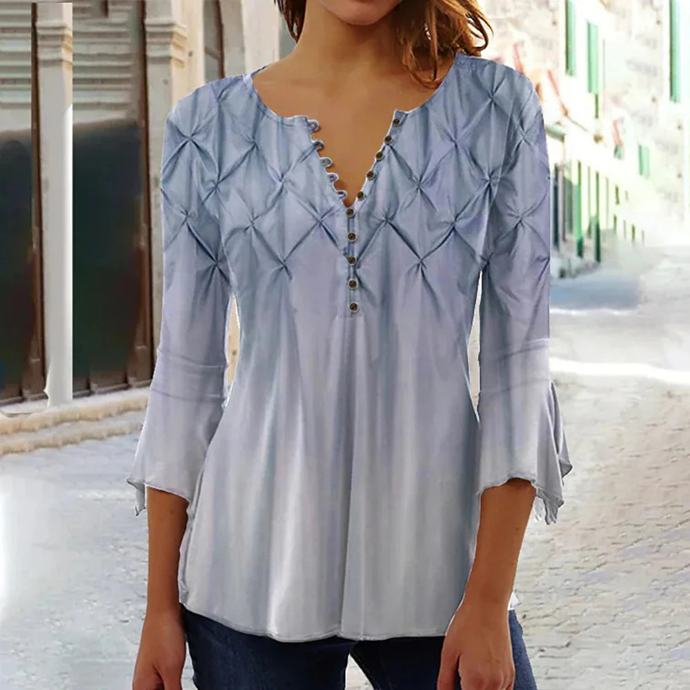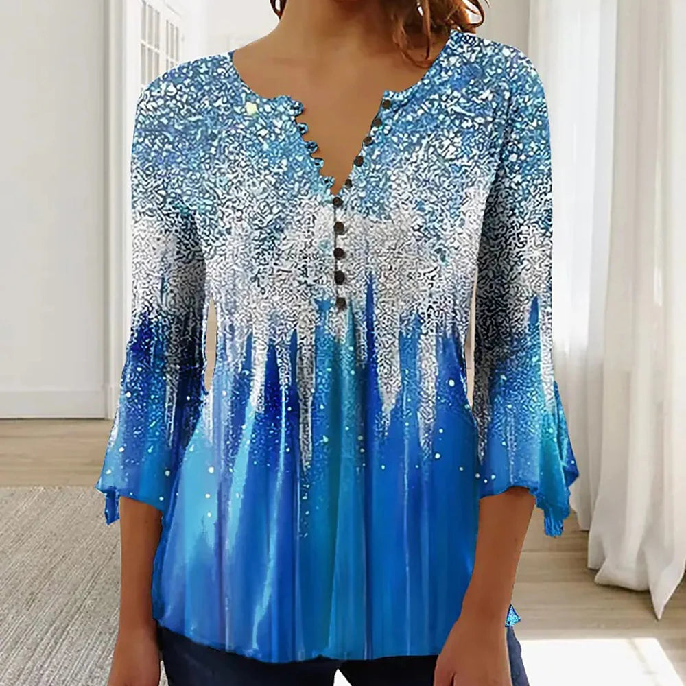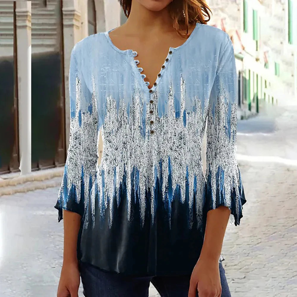 This women's casual top features a regular length and a flattering V-neck collar. Crafted from polyester with slight stretch, it offers comfortable wear and a classic style vibe. The top is adorned with a variety of prints and comes with regular 7/4 sleeves, making it a versatile and stylish addition to any casual wardrobe.
