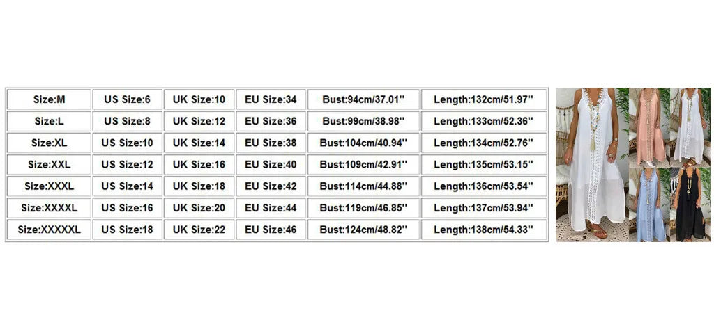 Women's Vintage Sleeveless Lace Spliced Maxi Dress Casual Sundress Summer Plus Size Elegant V-neck Hollow Out Loose Long Dress
