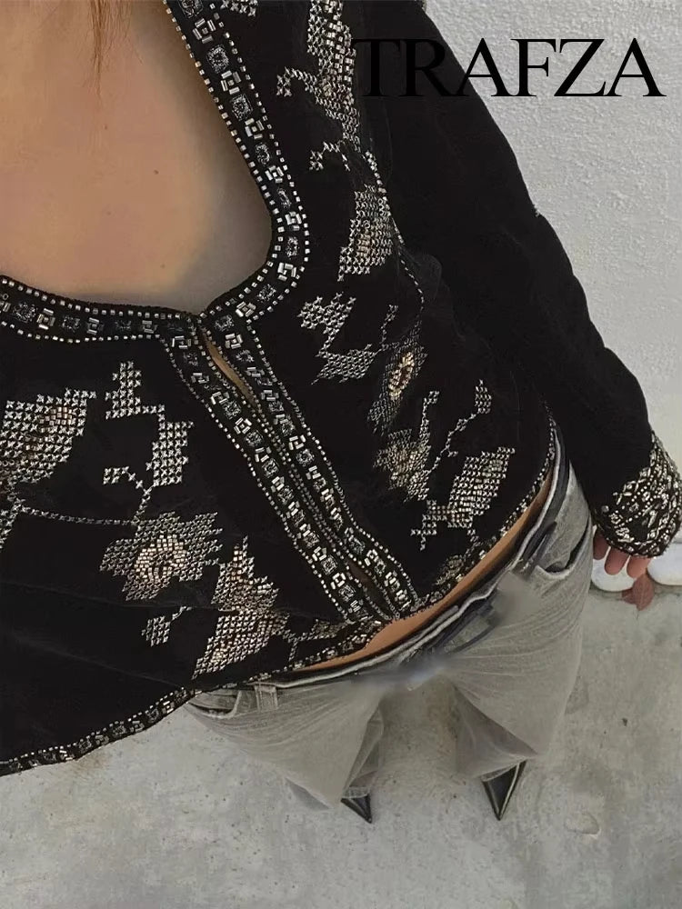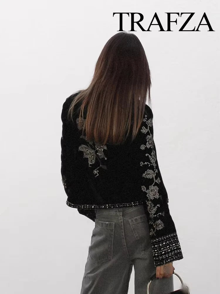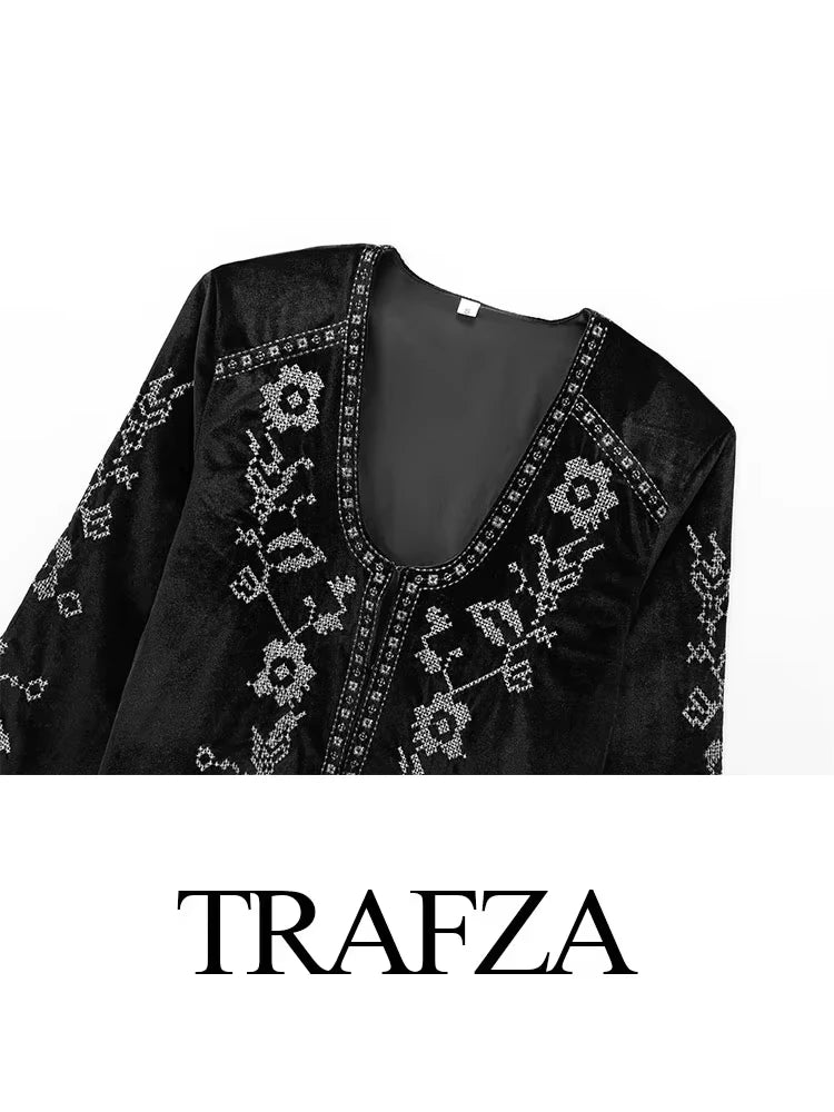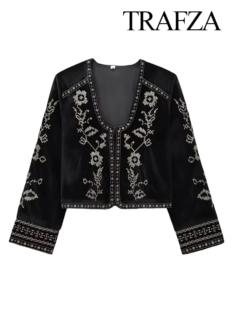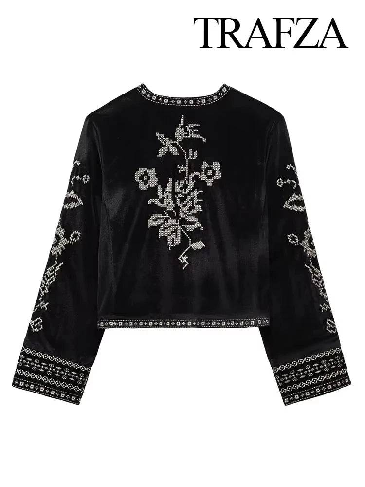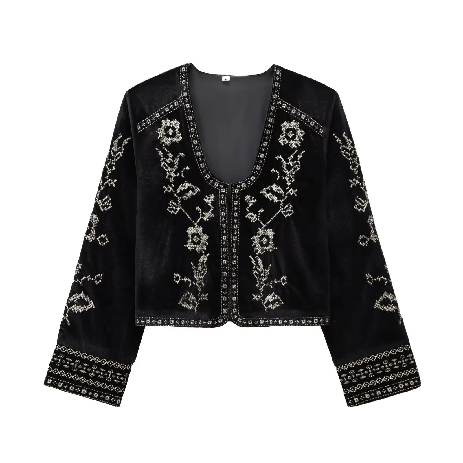 Women's Vintage Velvet Embroidered Jackets For Casual Long Sleeves Hidden Button Round Neck Elegant Outerwear
