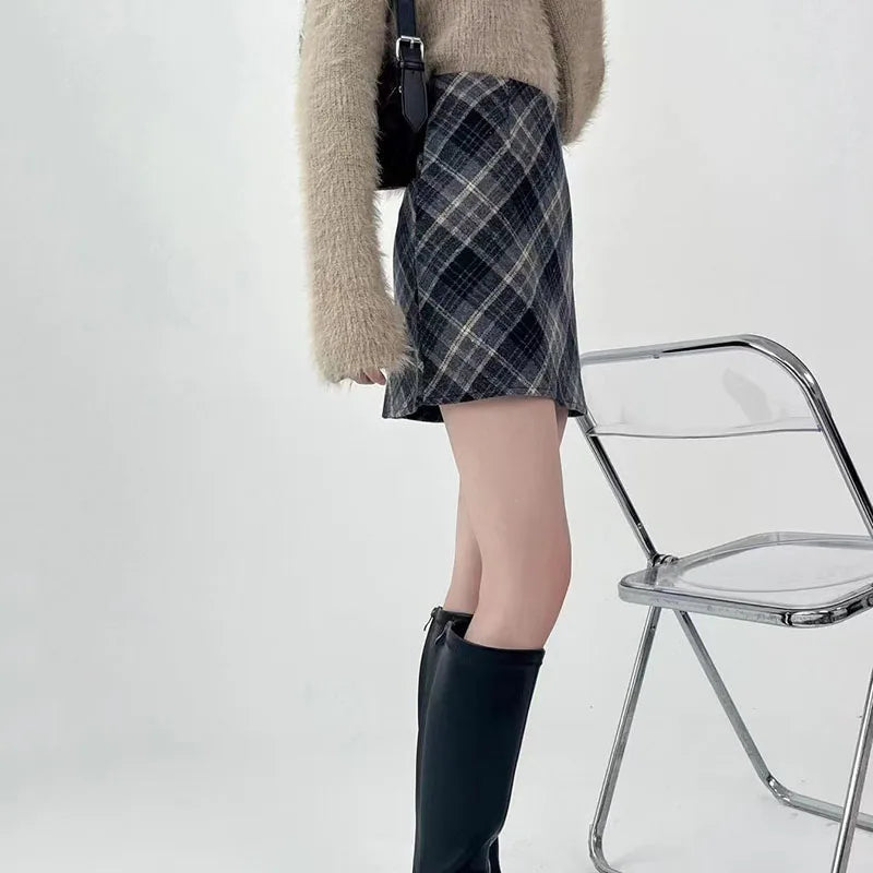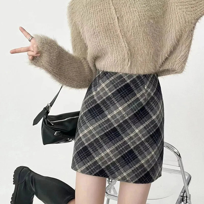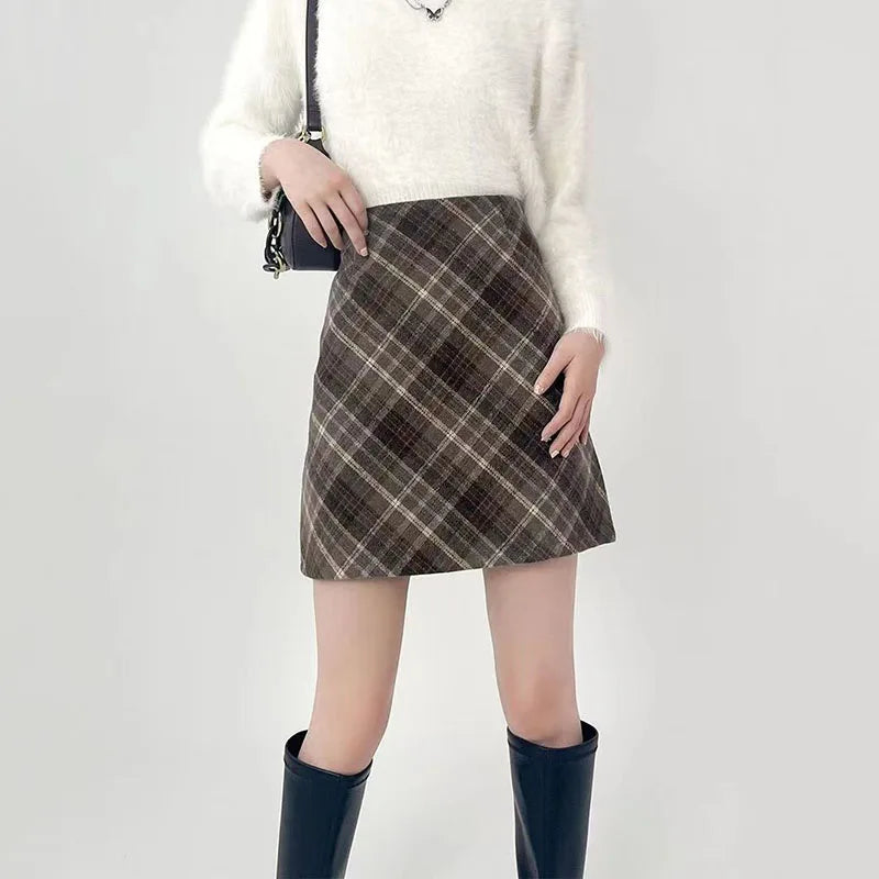 Woolen Plaid Mini Skirt Retro High Waist A-Line Tweed Skirt