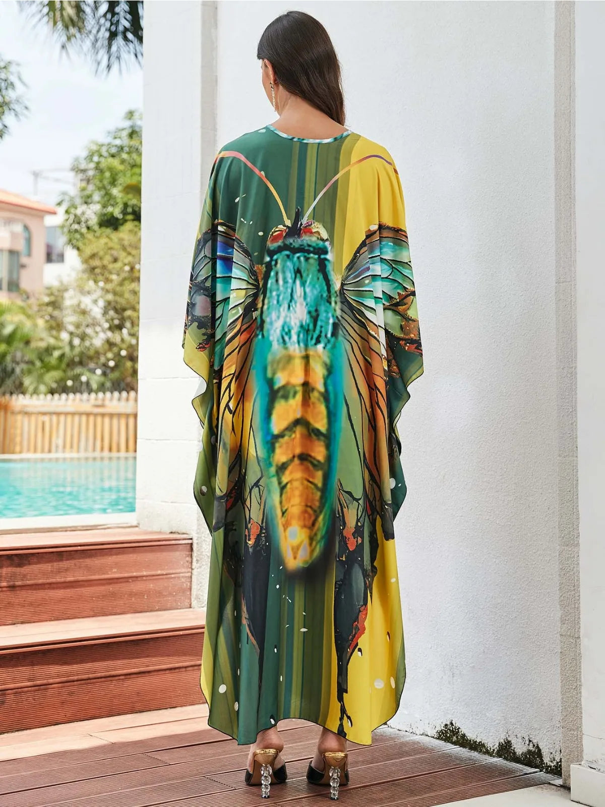 Yellow Butterfly Print Loose Fitting Long Robe Beach Vacation V-neck Sunscreen Clothing Kaftan